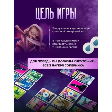 «Radlands. Земля руин» это дуэльная карточная игра с мощной синергией карт. В ней каждый игрок защищает по 3 уникальных лагеря. Для победы вы должны уничтожить все 3 лагеря соперника. Главный ресурс в игре вода. Тратьте воду, чтобы разыгрывать карты людей и событий и использовать способности карт, лежащих на столе.