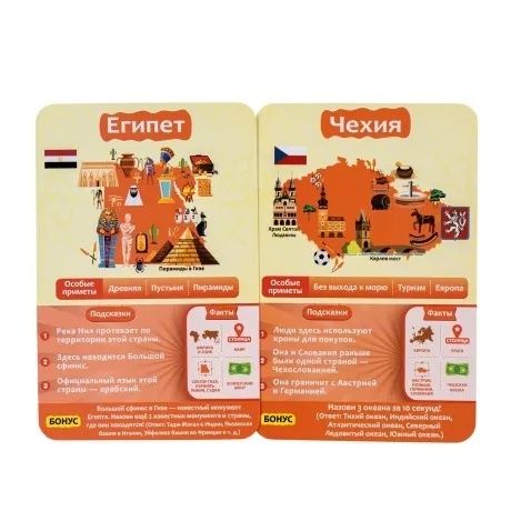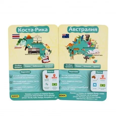 10 Вопросов – это серия образовательных игр для детей, способствующая расширению кругозора, развитию аналитического мышления и формированию навыков анализа. Участники, руководствуясь двумя случайными подсказками, фактами или приметами, а также 10 вопросами, пытаются разгадать, что изображено на карточке. Игра наполнена увлекательными фактами и красочными иллюстрациями, что делает процесс игры ещё захватывающим. Отличный выбор для семейных вечеров или уютных посиделок с друзьями. Путешествуя по миру, человек открывает для себя множество интересного! “10 Вопросов: Страны” приглашает вас расширить кругозор в кругу близких и способна бросить вызов даже взрослым! С помощью двух интересных фактов и десяти дихотомических вопросов догадайтесь, какая страна изображена на карточке ведущего. Есть ли у неё выход к морюx Предпочитают ли местные жители есть палочкамиx Эта настолка – отличный вариант для тех, кто хочет собрать за игровым столом все поколения разом так, чтобы всем было интересно и весело!