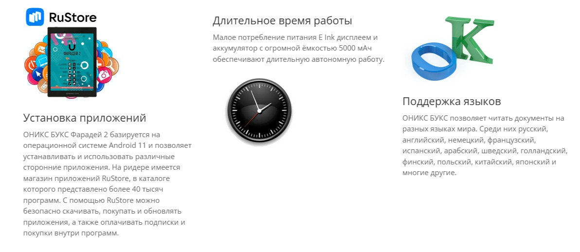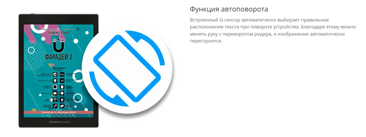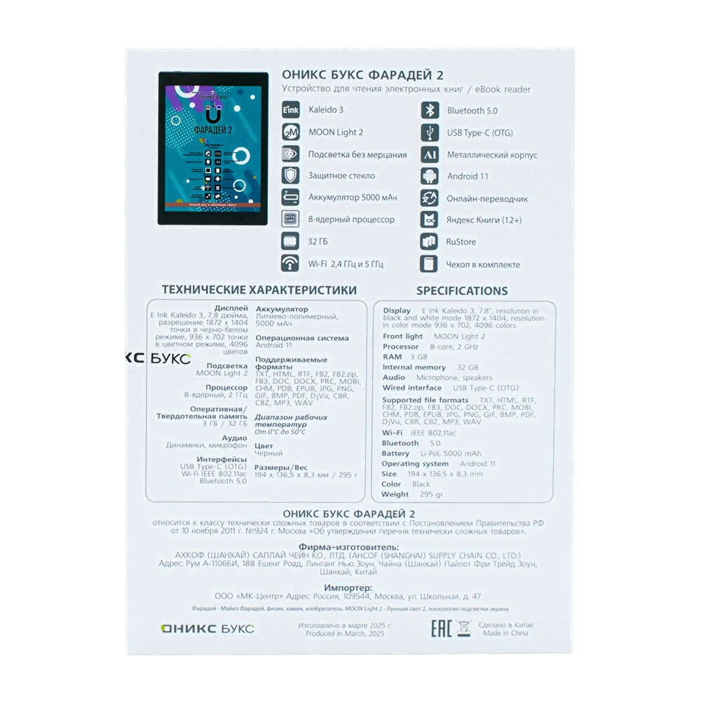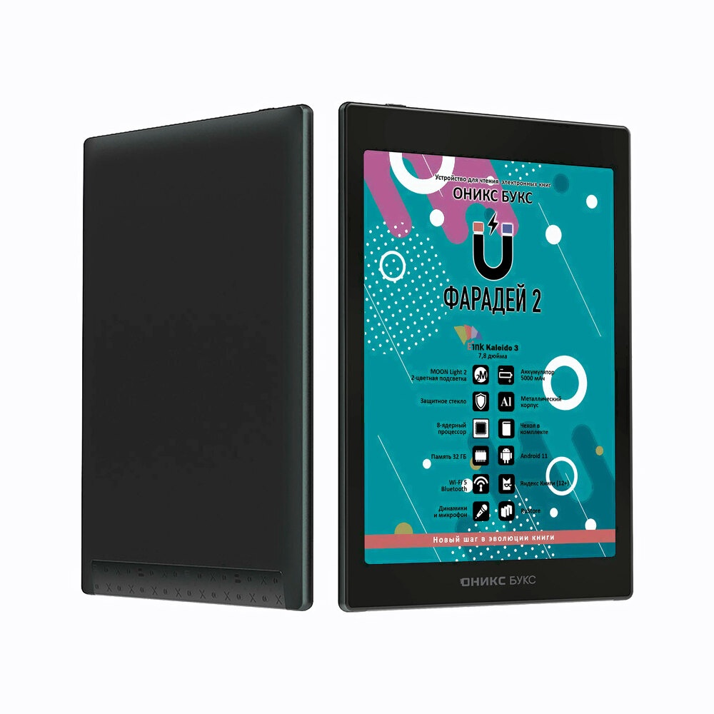 ОНИКС БУКС Фарадей 2 — ридер с 7.8-дюймовым цветным экраном E Ink Kaleido 3 с подсветкой и сенсорным управлением. Модель базируется на 8-ядерном процессоре и имеет 3 ГБ оперативной памяти. Устройство работает под управлением операционной системы Android 11 и позволяет устанавливать и использовать сторонние приложения. На ридере предустановлен магазин RuStore, в каталоге которого представлено более 40 тысяч программ. На устройстве установлено множество полезных приложений, включая онлайн библиотеку Яндекс Книги (12+). Благодаря встроенному аудиоплееру можно прослушивать музыку и аудиокниги, а наличие функции TTS позволяет озвучивать текстовые файлы. Модуль Wi-Fi дает возможность использовать сетевые сервисы, а поддержка Bluetooth — подключать внешние устройства. Модель выполнена в тонком металлическом корпусе, экран дополнительно закрыт защитным стеклом ONYX Glass. В комплекте с ридером поставляется стильный защитный чехол. Благодаря увеличенному экрану и способности отображать цвета модель станет отличным выбором для тех, кто планирует совмещать чтение книг и комиксов с работой с документами, имеющими цветные изображения.