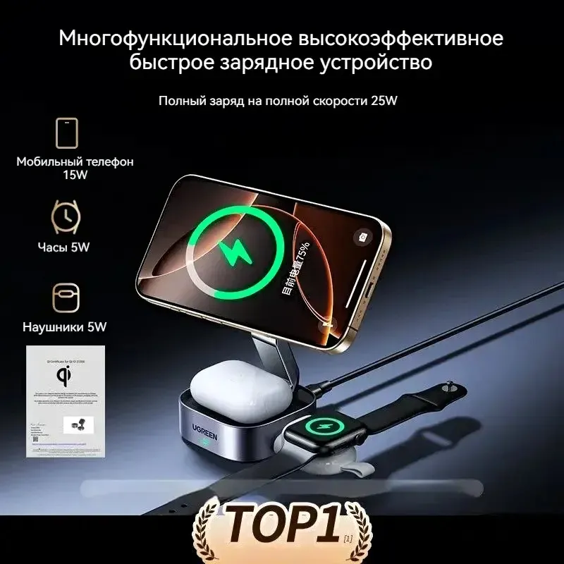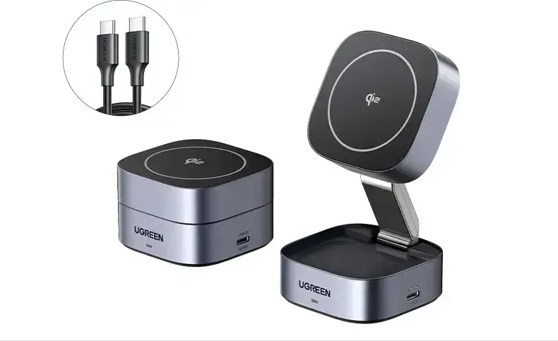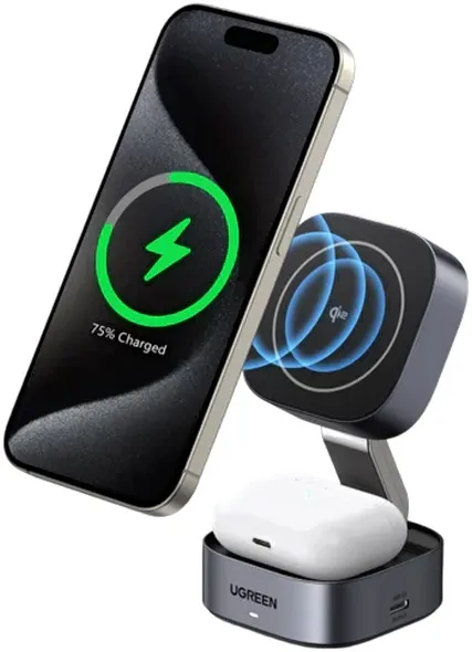 Беспроводное зарядное устройство Ugreen W702 действует с выходной мощностью 15 Вт. Универсальная подставка одновременно вмещает для зарядки смартфон и наушники. Магнитное позиционирование упрощает установку смартфона на площадке в правильном положении.