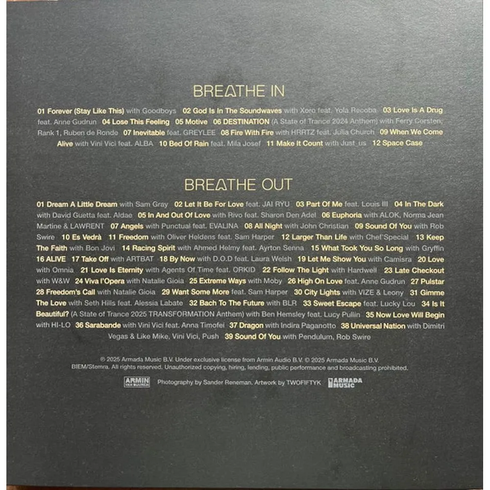 Лицензионное издание, выпущенное на виниле. В альбом вошли следующие композиции: Armin van Buuren & Goodboys - Forever (Stay Like This), Armin van Buuren & Xoro feat. Yola Recoba - God Is In The Soundwaves, Armin van Buuren feat. Anne Gudrun - Love Is A Drug, Armin van Buuren - Lose This Feeling, Armin van Buuren - Motive, Armin van Buuren, Ferry Corsten, Rank 1 & Ruben de Ronde - Destination (A State of Trance 2024 Anthem), Armin van Buuren feat. GREYLEE - Inevitable, Armin van Buuren & HRRTZ feat. Julia Church - Fire With Fire, Armin van Buuren & Vini Vici feat. ALBA - When We Come Alive, Armin van Buuren feat. Mila Josef - Bed Of Rain, Armin van Buuren & Just_us - Make It Count, Armin van Buuren - Space Case, Armin van Buuren & Sam Gray - Dream A Little Dream, Armin van Buuren feat. JAI RYU - Let It Be For Love, Armin van Buuren feat. Louis III - Part Of Me, Armin van Buuren & David Guetta feat. Aldae - In The Dark, Rivo vs Armin van Buuren feat. Sharon Den Adel - In And Out Of Love, Armin van Buuren, Norma Jean Martine, LAWRENT - Euphoria (with ALOK), Armin van Buuren & Punctual feat. EVALINA - Angels, Armin van Buuren & John Christian - All Night, Armin van Buuren & Rob Swire - Sound of You, Armin van Buuren - Es Vedr?, Oliver Heldens & Armin van Buuren feat. Sam Harper - Freedom, Armin van Buuren & Chef'Special - Larger Than Life, Armin van Buuren & Bon Jovi - Keep The Faith, Armin van Buuren & Ahmed Helmy - Racing Spirit, Armin van Buuren & Gryffin - What Took You So Long, Armin van Buurene - ALIVE, ARTBAT & Armin van Buuren - Take Off, Armin van Buuren & D.O.D feat. Laura Welsh - By Now, Camisra & Armin van Buuren - Let Me Show You, Armin van Buuren & Omnia - Love, Armin van Buuren & Agents Of Time feat. ORKID - Love Is Eternity, Armin van Buuren & Hardwell - Follow The Light, Armin van Buuren & W&W - Late Checkout, Armin van Buuren & Natalie Gioia - Viva l'Opera, Armin van Buuren & Moby - extreme Ways, Armin van Buuren feat. Anne Gudrun - High On Love, Armin van Buuren - Pulstar, Armin van Buuren & Natalie Gioia - Freedom's Call, Armin van Buuren feat. Sam Harper - Want Some More, Armin van Buuren & VIZE & Leony - City Lights, Armin van Buuren & Seth Hills feat. Alessia Labate - Gimme The Love, Armin van Buuren & BLR - Bach To The Future, Armin van Buuren feat. Lucky Lou - Sweet Escape, Armin van Buuren & Ben Hemsley feat. Lucy Pullin - Is It Beautiful? (A State of Trance 2025 TRANSFORMATION Anthem), Armin van Buuren & HI LO - Now Love Will Begin, Armin van Buuren & Vini Vici feat. Anna Timofei - Sarabande, Indira Paganotto & Armin van Buuren - Dragon, Dimitri Vegas & Like Mike, Armin van Buuren, Vini Vici, Push - Universal Nation, Pendulum & Armin van Buuren & Rob Swire - Sound Of You