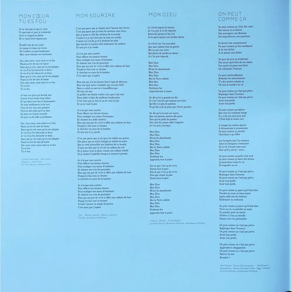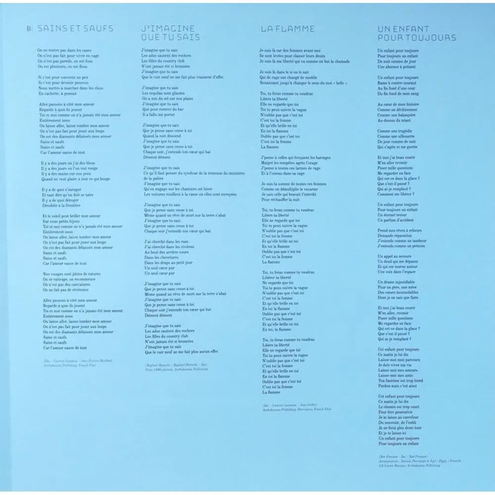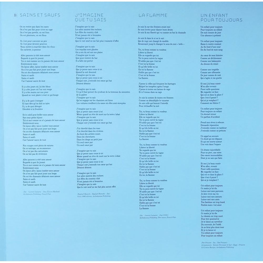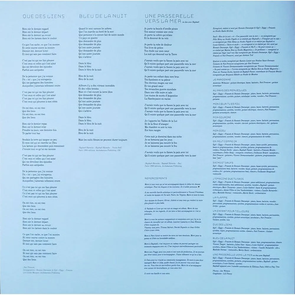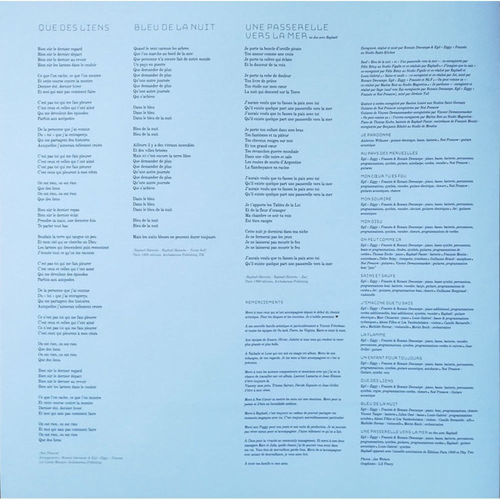 Je pardonne, Au pays des merveilles, Mon c?ur tu es fou, Mon sourire, Mon Dieu, On peut comme ?a, Sains & saufs, J’imagine que tu sais, La flamme, Un enfant pour toujours, Que des liens, Bleu de la nuit, Une passerelle vers la mer – en duo avec Rapha?l