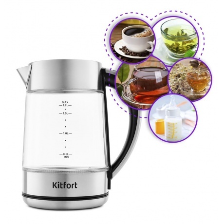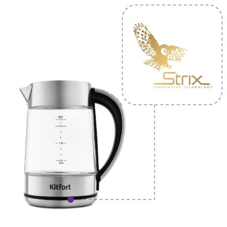 Электрический чайник Kitfort КТ-690 может вскипятить воду или нагреть её до температуры от 40 до 100 °С с шагом в 5 °С, что удобно при заваривании различных сортов чая, приготовлении кофе и подогреве детского питания. На ручке чайника находится LED-дисплей, кнопки включения, поддержания температуры и две кнопки регулировки температуры. Каждая кнопка оснащена световым индикатором. LED-дислпей показывает текущую температуру, а при установке температуры – установленную. Чайник оснащён контроллером Strix - № 1 среди поставщиков компонентов для электрочайников. Он устраняет риски короткого замыкания и возгорания прибора. Обеспечивает защиту при закипании, при включении чайника без воды и при снятии с базы во время работы. Для максимально лёгкого мытья и удобного заливания воды чайник оснащён целиком съёмной крышкой и широким горлышком.