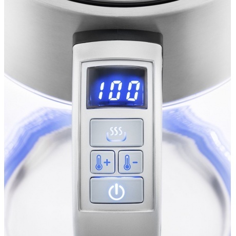 + На ручке чайника имеются дисплей и кнопки старт/стоп, поддержания температуры и установки температуры от 40 до 100 градусов.