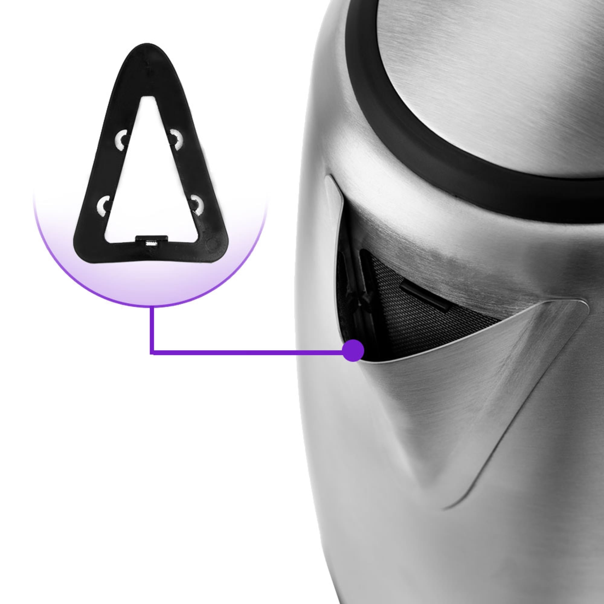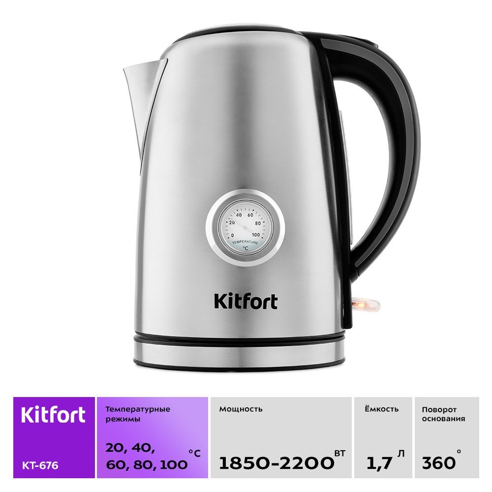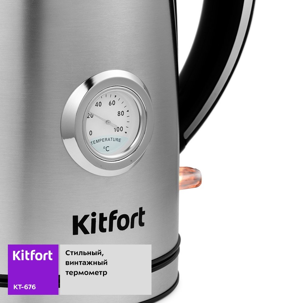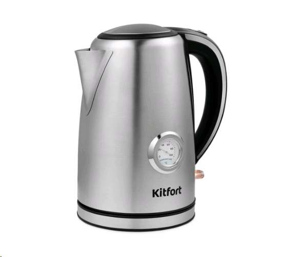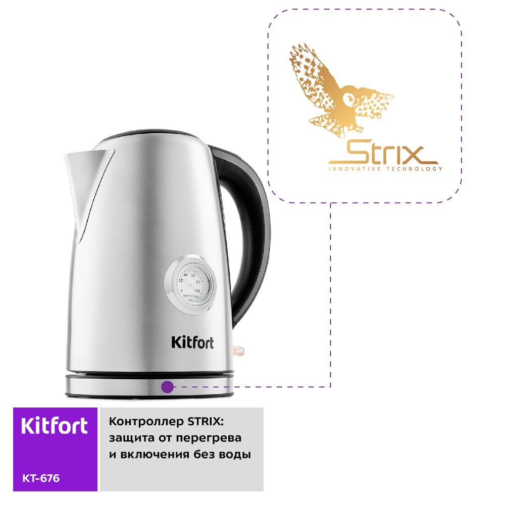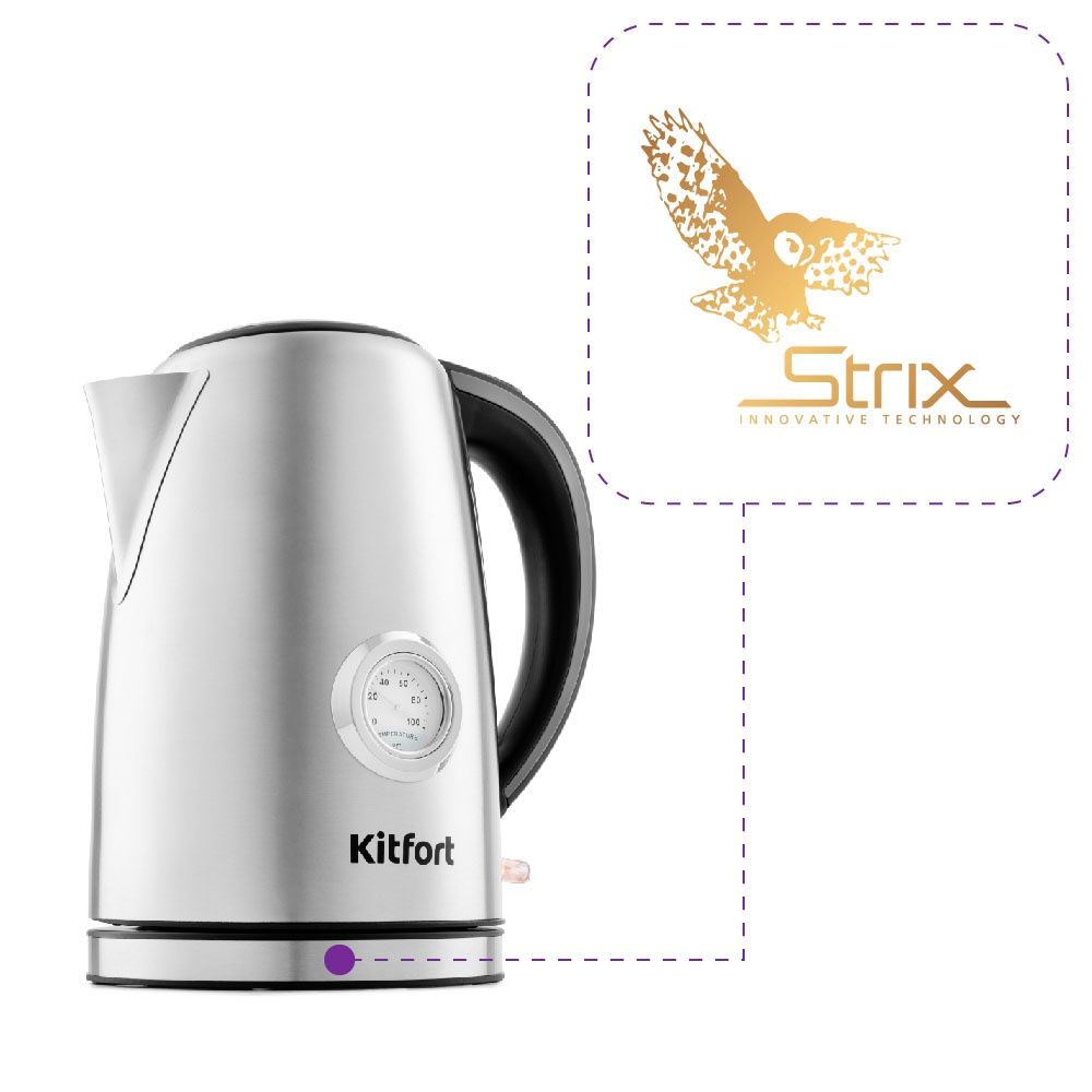 На корпусе чайника Kitfort KT-676 расположен термометр, который показывает температуру воды. Это удобно, если вы готовите напитки, для которых требуются определенная температура воды, например, зеленый чай, белый чай, кофе и т. д. Корпус чайника выполнен из нержавеющей стали. Внутренняя поверхность чайника полностью состоит из металла, благодаря чему вода не соприкасается с пластиком. Ручка чайника пластиковая, не нагревается и удобно лежит в руке. Чайник оснащён контроллером Strix - № 1 среди поставщиков компонентов для электрочайников. Он устраняет риски короткого замыкания и возгорания прибора. Обеспечивает защиту при закипании, при включении чайника без воды и при снятии с базы во время работы. В носике чайника расположен съёмный фильтр от накипи из нейлона, который задерживает частички накипи и предотвращает их попадание в чашку.