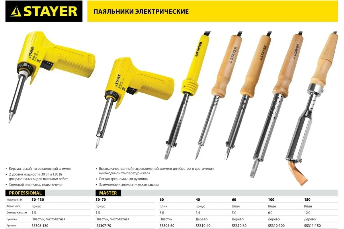 Паяльник Stayer Profi 55308-130 - данный товар вы можете купить по цене 870 руб. в интернет-магазине КотоФото. Характеристики, описание товара, фото и цена представлены на карточке товара. Заказать товар вы можете по телефону 8(800)505-43-75 в Казани.