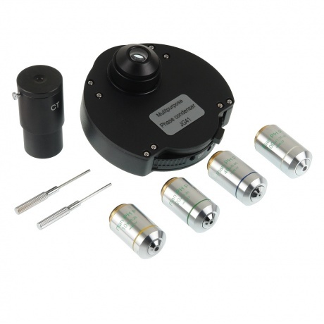 Устройство для наблюдения методом фазового контраста ФКУ предназначается для исследования малоконтрастных объектов, не видимых в микроскопы при обычных условиях наблюдения. Основными частями устройства являются фазовый конденсор, фазовые объективы и вспомогательный микроскоп. Крепление фазового конденсора типа &quot, ласточкин хвост&quot. Фазово-контрастная микроскопия - это метод исследования, основанный на получении с помощью специальных приспособлений контрастного изображения различающихся по плотности структур бесцветных прозрачных микрообъектов (например, живых микроорганизмов и тканевых культур). При прохождении пучка света через неокрашенный объект изменяется лишь фаза колебания световой волны, что не воспринимается человеческим глазом. Чтобы изображение стало контрастным, необходимо превратить фазовые изменения световой волны в видимые амплитудные. Это достигается с помощью фазово-контрастного конденсора и фазового объектива.Принцип действия устройства основан на методе фазового контраста, позволяющем наблюдать неокрашенные малоконтрастные препараты. Конденсор может быть использован для наблюдения обычным способом; для этого под револьверным диском имеется ирисовая диафрагма, а в диске револьвера, кроме кольцевых диафрагм, имеется свободное отверстие для пропускания всего пучка света. Фазовый конденсор вставляется в кольцо кронштейна конденсора микроскопа вместо обычного светлопольного конденсора и зажимается винтом обычным способом. Смена кольцевых диафрагм, в зависимости от применяемого объектива, производится поворотом револьверного диска за накатанную часть до фиксации, причем в окне кожуха конденсора должна появиться цифра, соответствующая увеличению применяемого объектива или надпись BF, соответствующая свободному отверстию для работы в светлом поле, или надпись &quot, DF&quot, для работы по методу темного поля. Вспомогательный микроскоп применяется при центрировке изображения кольцевой диафрагмы конденсора относительно фазового кольца объектива.