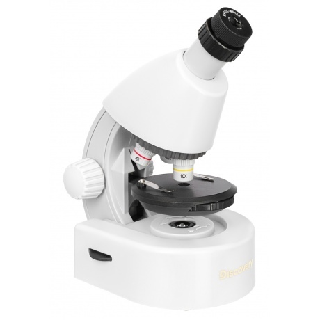 Микроскоп Discovery Micro станет прекрасным проводником в мир микроскопии. Этот простой в использовании оптический прибор позволяет узнать, как выглядят клетки в тканях, на что похожи крошечные организмы, живущие в воде, как устроены конечности и крылья насекомых и многое другое. Благодаря небольшим размерам и весу микроскоп можно брать с собой на природу или на дачу, чтобы разнообразить наблюдения. Оптическая система состоит из трех объективов кратностью 4х, 10х и 40х и двухпозиционного окуляра, который в одном положении дает увеличение 10х, а в другом – 16х, т. е. представляет собой два окуляра. Общий диапазон приближения составляет от 40 до 640 крат, что позволяет наблюдать многие объекты микромира. Но так как микроскоп относится к классу начальных, то увидеть бактерии или клетки крови с его помощью не получится. А вот в сочетании с готовыми микропрепаратами из наборов он даст прекрасный результат. Монокулярная насадка имеет наклон в 45°, поэтому длительные наблюдения микромира не вызывают перенапряжения мышц. Настройка резкости производится вручную, для этого используются ручки грубой фокусировки.