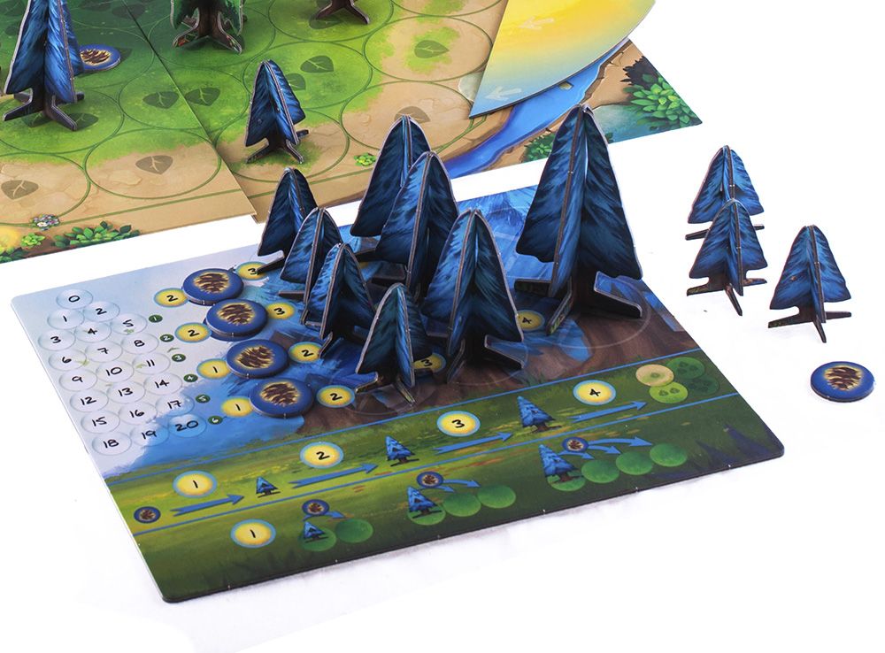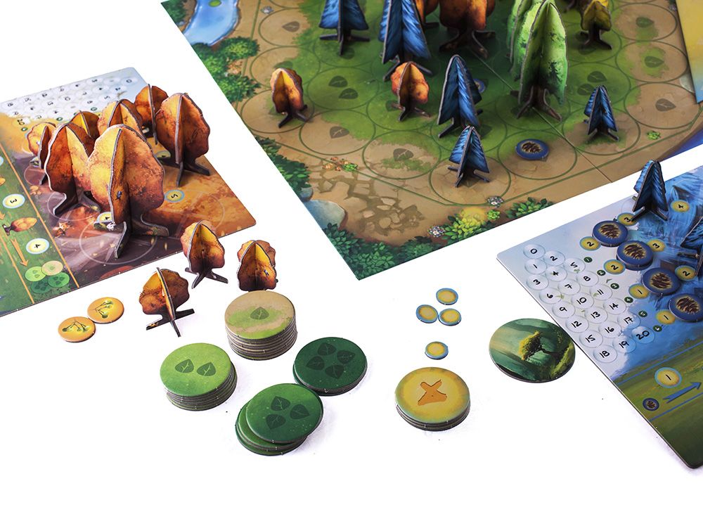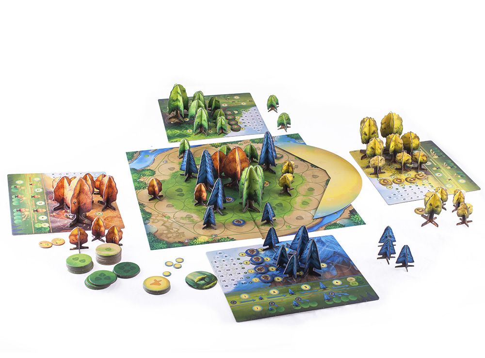 1 игровое поле, 1 сегмент солнца, 4 жетона оборотов солнца, 4 планшета игроков, 1 жетон первого игрока, 24 жетона победных очков, 4 жетона солнечного света, 24 жетона семян (по 6 каждого цвета), 32 маленьких дерева (по 8 каждого цвета), 16 средних деревьев (по 4 каждого цвета), 8 больших деревьев (по 2 каждого цвета), правила игры