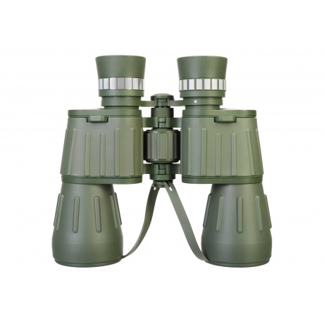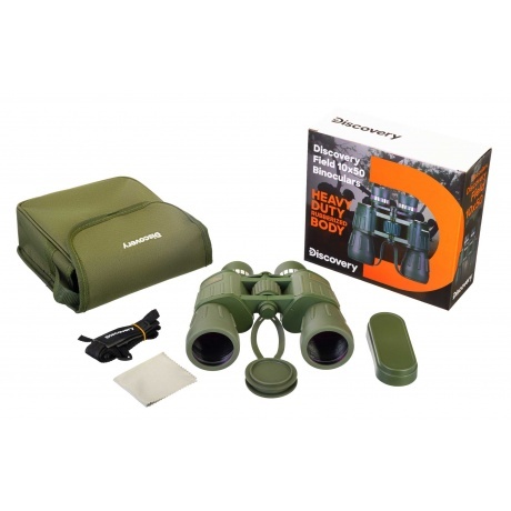 Бинокль Discovery Field 10x50 – это оптический прибор с влагозащитой, предназначенный для наблюдений на открытой местности. Он отлично проявит себя при охране территорий, во время охоты или экспедиции, а также в туристическом походе. Оптика бинокля построена по классической Porro-схеме, светосильные 50-миллиметровые объективы собирают много света, на линзы нанесено многослойное просветляющее покрытие. В результате оптика выстраивает яркое высококонтрастное изображение как при свете дня, так и в сумерках. Материалом оптики Discovery Field 10x50 послужило оптическое стекло марки BK-7, а корпус изготовлен из прочного пластика и обрезинен. Оптико-механические элементы конструкции надежно защищены от повреждений и попадания внутрь влаги. Внешнее покрытие текстурировано – это препятствует выскальзыванию бинокля даже из мокрых рук. Прибор прост в настройке: достаточно навести объективы на резкость с помощью удобного барабана центральной фокусировки, при необходимости откорректировать диоптрии, и можно приступать к поиску цели. Для стационарных наблюдений бинокль может быть установлен на штатив (предусмотрено стандартное гнездо 1/4 дюйма).