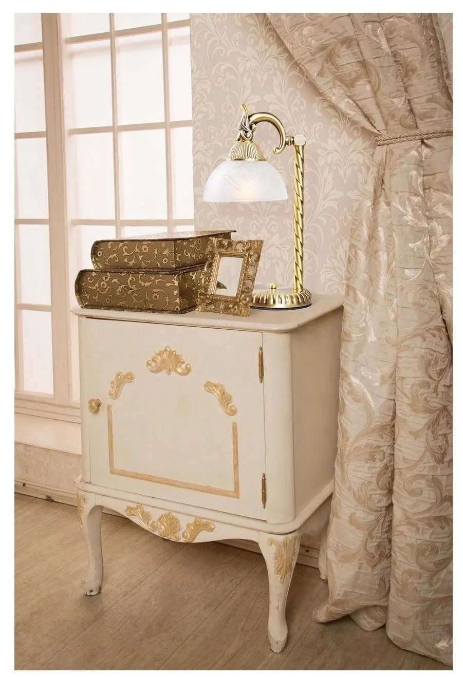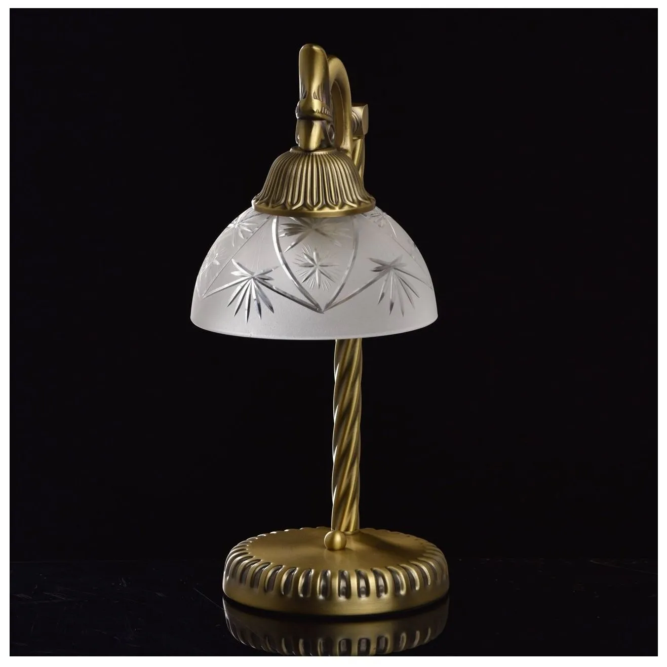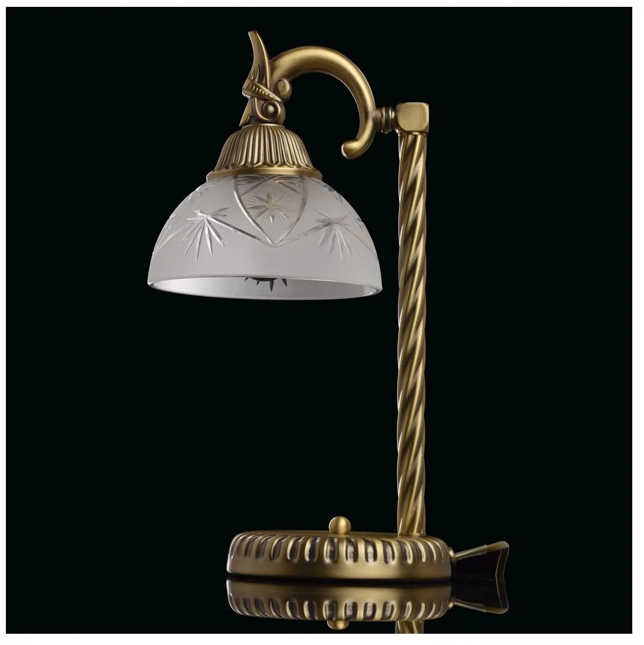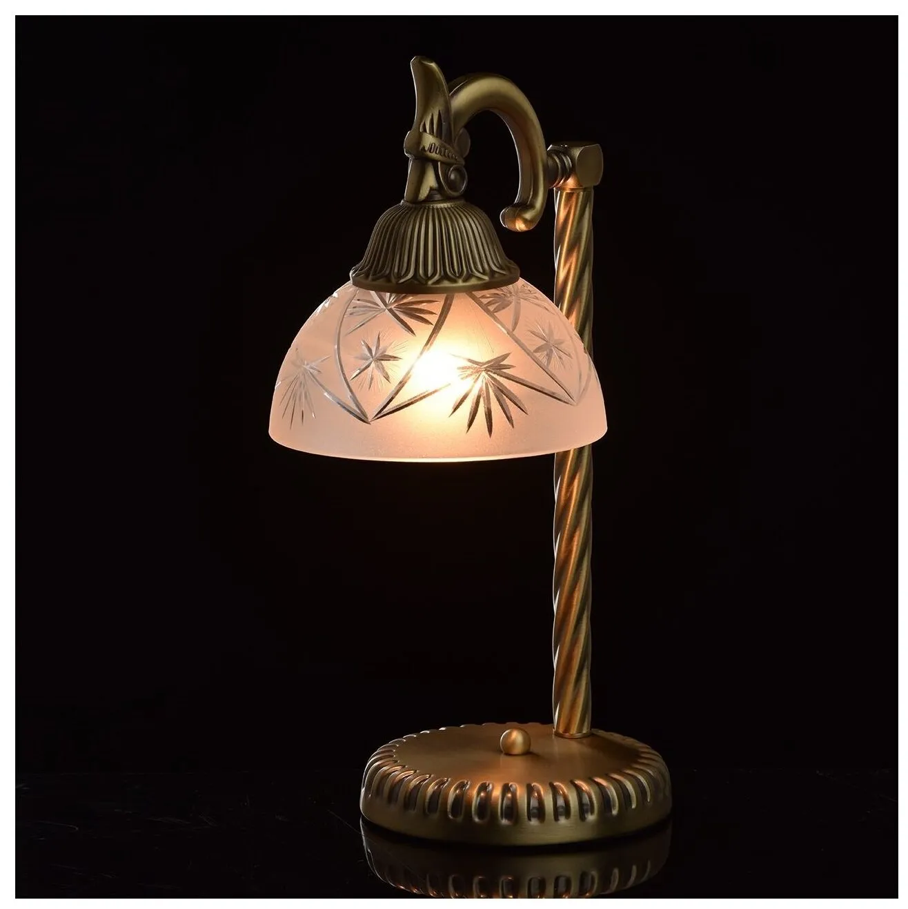 Торжественная и нарядная форма светильника Афродита подчеркнёт классический интерьер, за счет нарочитой помпезности и превосходства линий! Округлый плафон изготовлен из матированного стекла с лазерным ажуром лучевидного рисунка. Металлическое основание привлекает мягкостью оттенка античной бронзы, которая имеет лёгкий эффект патины. Величественный образ настольного светильника Афродита превосходно украсит интерьер, в котором важны строгость линий и классика формы.Преимущества моделиКлассический и благородный дизайн с элементами античного стиля. Высокие параметры освещенности. Широкая семья - возможность комплексного освещения интерьера.Технология производстваОснование и стержень настольной лампы выполнена из сплава железа и гальванизированы в цвет античной бронзы с эффектом патинирования. Стержень выполнен по технологии твист. Рожок выполнен из сплава алюминия по технологии художественного литья. Плафон изготовлен из прозрачного стекла, обработанного пескоструйным матированием с рисунком нанесенным по технологии алмазной резьбы.