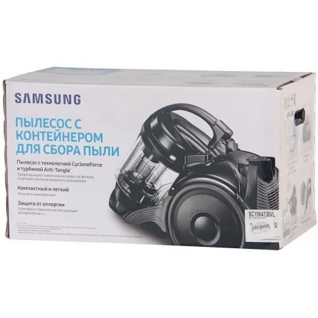 Пылесос Samsung VC4100 — легкий и компактный, что дает возможность без особого труда перемещать его во время уборки. Его вес составляет всего 4.6 кг, а легкий корпус на 16% меньше по сравнению со стандартной моделью Samsung. Турбина пылесоса CycloneForce оснащена специальной решеткой, которая защищает ее от забивания волосами и шерстью животных. Таким образом обеспечивается максимальная производительность пылесоса и отсутствие необходимости очищать его от спутанных волос и шерсти вручную. Мягкий S-образный защитный бампер «Furniture Guard S» предотвращает порчу мебели и стен, если вы случайно их заденете, а также помогает пылесосу преодолевать небольшие препятствия, что ускоряет процесс уборки. Простой фильтр из пористого пеноматериала обеспечивает хороший захват пыли и легко поддается мойке и чистке. Чтобы очистить фильтр, достаточно просто прополоскать его в воде, после чего он сможет обеспечить такую же высокую мощность всасывания. Случались ли у вас приступы аллергической реакции на пыль после уборкиx Система фильтрации частиц пыли и аллергенов снизит до минимума проникновение частиц пыли и аллергенов обратно в помещение — сертифицирована SLG и Британским фондом по борьбе с аллергией (BAF).