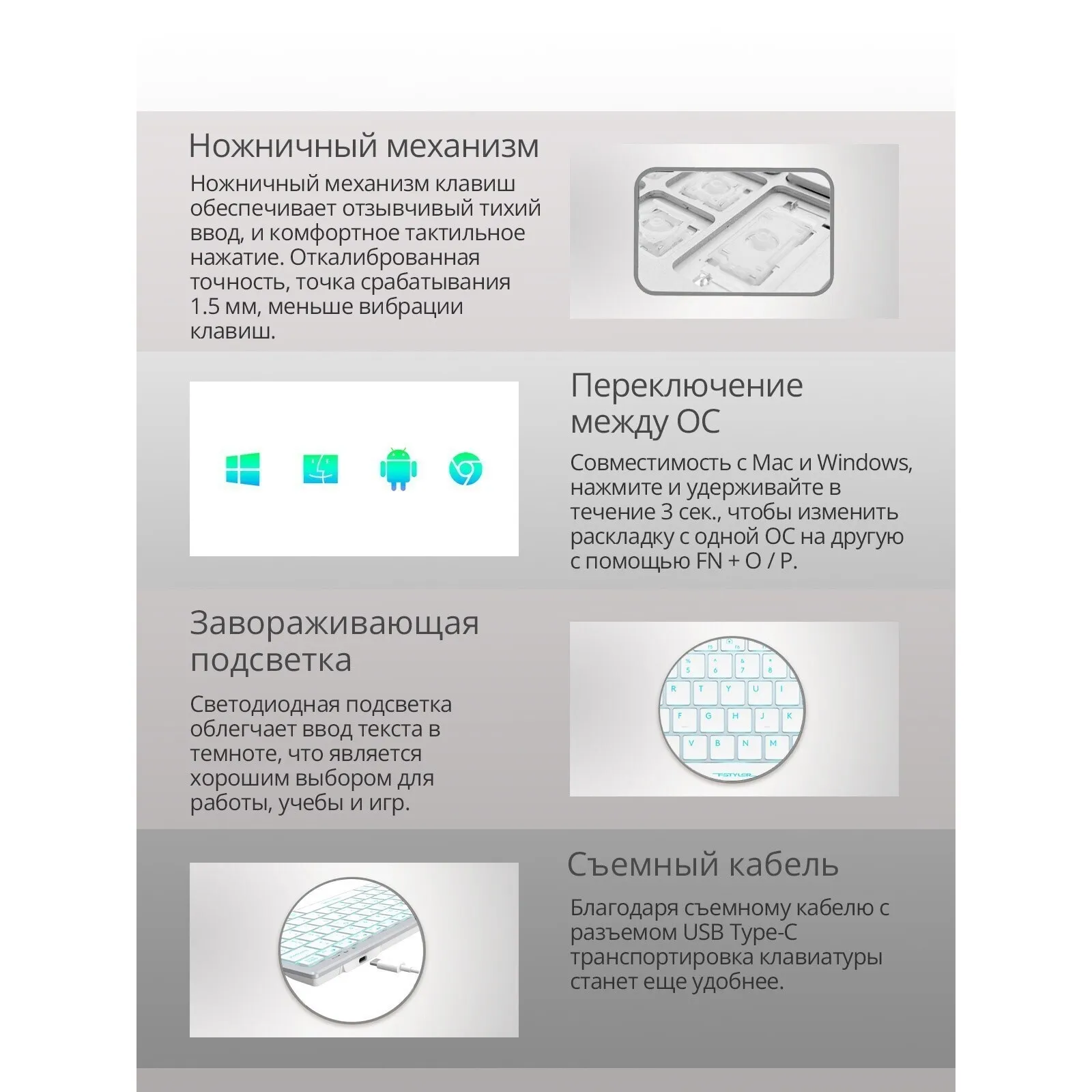 Клавиатура A4Tech Fstyler FX61 со светодиодной подсветкой RGB обеспечивает высокое удобство работы в программах, при запуске мультимедийного контента, в компьютерных играх. В данной модели реализованы низкопрофильные клавиши с ножничным механизмом, которые отличаются легким нажатием с точным откликом и низким уровнем шума. Светодиодная подсветка облегчает набор текста в условиях недостаточной освещенности. На основании расположены нескользящие ножки для повышения устойчивости. A4Tech Fstyler FX61 подключается по проводному интерфейсу USB и имеет кабель длиной 1.5 метра.