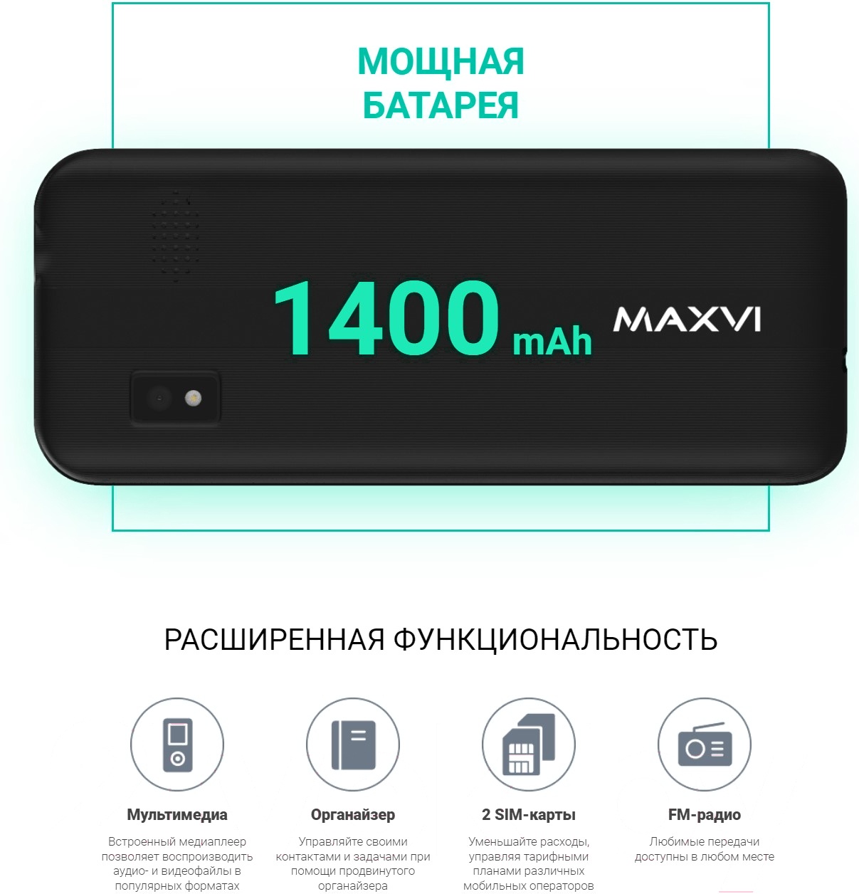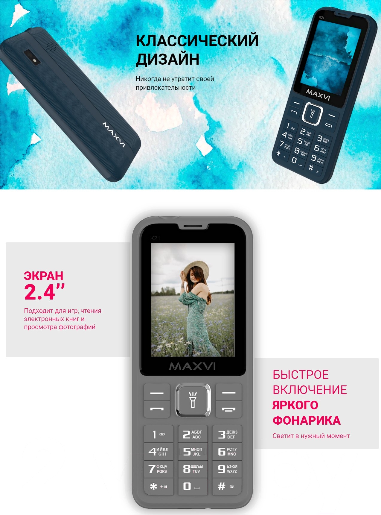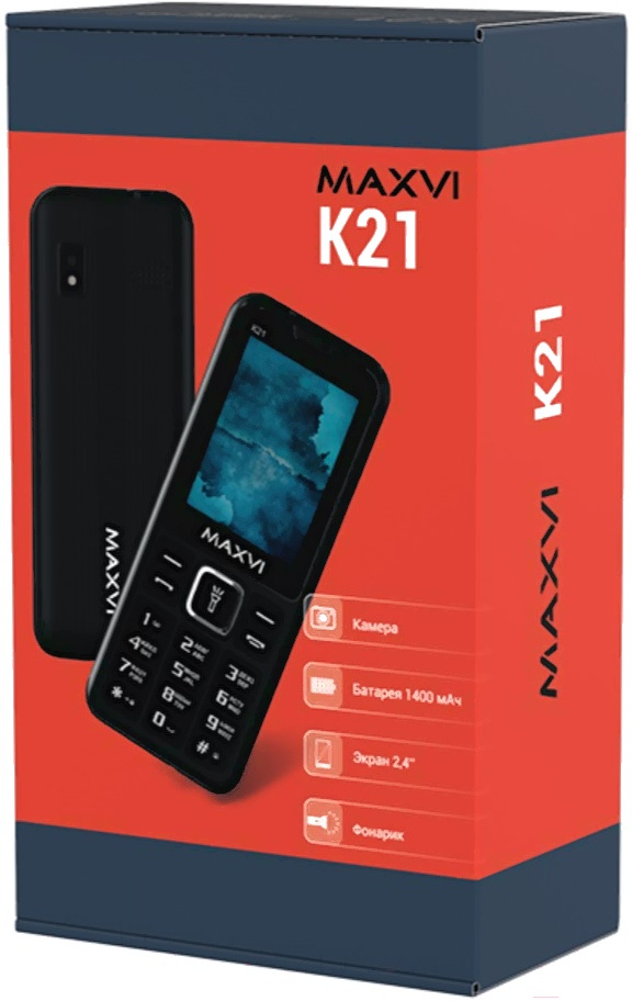 Maxvi K21 – телефон в классическом дизайне с экраном 2,4”, двумя SIM-картами, удобной клавиатурой, аккумуляторной батареей 1400 mAh и ярким фонариком. Maxvi K21 незаменим для комфортного и продолжительного общения!