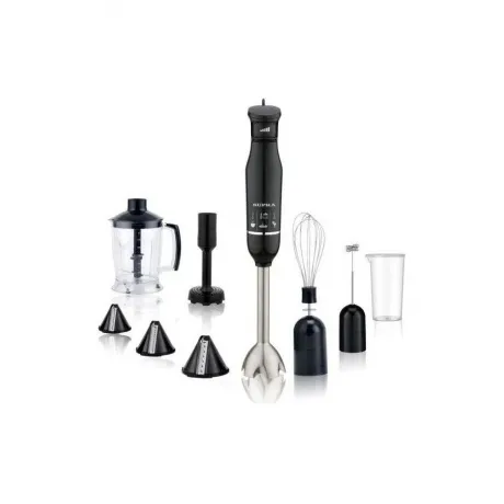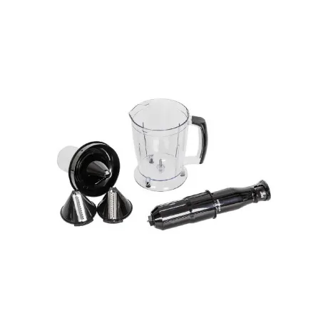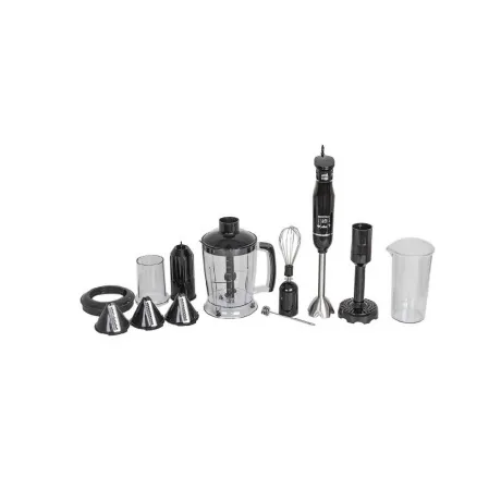 блендер, съемная насадка-блендер из нержавеющей стали, съемная насадка-венчик из нержавеющей стали, венчик для взбивания молочной пенки, измельчитель с конусными насадками 1,25 л., насадка для картофельного пюре, мерный стакан с крышкой 600 мл., инструкция на русском языке, гарантийный талон