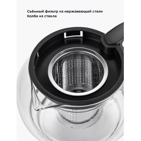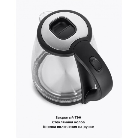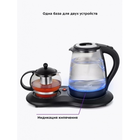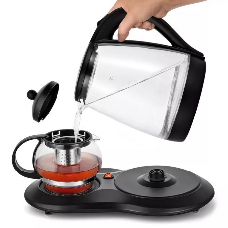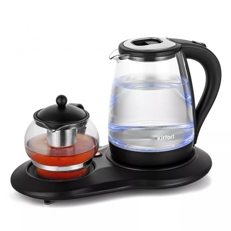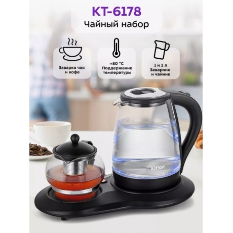 Стильный и функциональный чайный набор Kitfort КТ-6178 состоит из чайника ёмкостью 2 л, кувшина с фильтром для заварки ёмкостью 1 л и базы. Набор поможет вам не только вскипятить воду, но и заварить чай или кофе за пару движений! Кувшин для заварки изготовлен из термостойкого стекла и имеет съёмный фильтр для чая или кофе. В месте установки кувшина на базу присутствует скрытый нагревательный элемент с функцией поддержания тепла. Корпус чайника выполнен из стекла с вставкой из пластика. Нагревающий элемент встроен в дно чайника под нержавеющей пластиной. Мерная шкала находится на боковой стороне стеклянной части корпуса. На базе расположена кнопка включения поддержания тепла, а сама база изготовлена из пластика. На базе компактно располагается чайник и кувшин. Центральный контакт для чайника даёт возможность ставить чайник в любом положении, обеспечивая вращение на 360°.