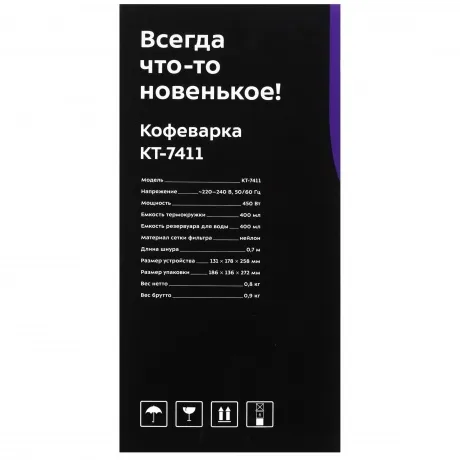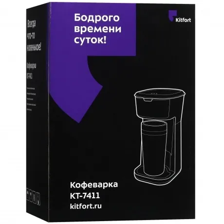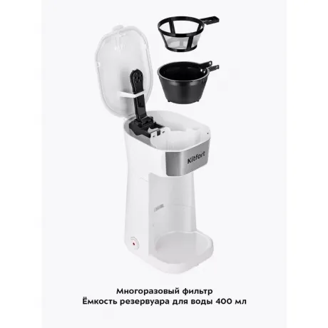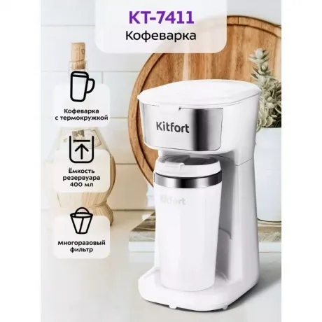 Капельная кофеварка КТ-7411 готовит ароматный черный кофе из молотого кофе одним нажатием кнопки. Компактная кофеварка экономит место на кухне и рассчитана на приготовление кофе за 1 раз на 1-3 чашки. Многоразовый фильтр вмещает 15 грамм кофе._x000D_ Горячий кофе за пару мгновений!_x000D_ Кнопка «Вкл/Выкл» включает и выключает устройство. Когда кофеварка работает, горит индикатор кнопки «Вкл/Выкл».Кофеварка отключается автоматически через 7 минут после включения._x000D_ Свежий напиток с собой!_x000D_ Термокружка выполнена из нержавеющей стали и пластика, что позволяет сохранить напиток тёплым. Отверстие для питья имеет удобную форму и закрывается крышкой, поэтому вы сможете взять кофе с собой и пить на ходу._x000D_ Многоразовый фильтр_x000D_ В кофеварке горячая вода медленно поступает в фильтр с молотым кофе. Многоразовым фильтром можно пользоваться любое количество раз. Сетка фильтра изготовлена из нейлона. Фильтр вмещает 15 грамм молотого кофе, а резервуар для воды имеет емкость 400 мл._x000D_ Помощник для доброго утра!_x000D_ Кофеварка КТ-7411 обладает не только большим функционалом, но и компактным размером и украсит любую кухню! Угостить гостей чашкой горячего кофе или взять любимый напиток с собой по пути на работуx Выбирать вам!