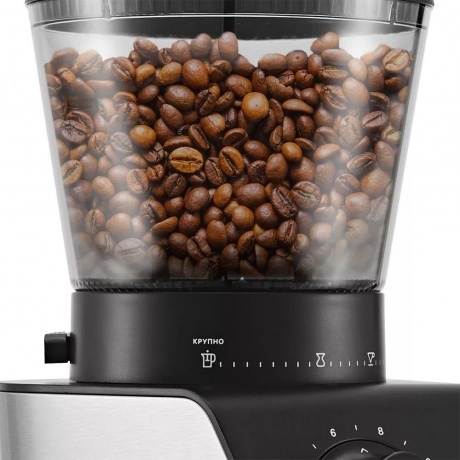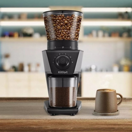 Жерновая кофемолка КТ-7245 предназначена для помола кофейных зёрен. Она имеет конические жернова из нержавеющей стали. Кофемолка даёт равномерный помол и позволяет настроить его степень: от мелкого - для эспрессо кофеварки, до крупного - для френч-пресса. Поворотом регулятора можно настроить количество порций кофе. Вы можете выбрать 212 порций, 1 порция равна чашке эспрессо. От порций зависит время работы. Можно настроить помол: от мелкого - для эспрессо кофеварки, до крупного - для френч-пресса. На регулятор помола нанесена специальная шкала. Для регулировки помола поворачивайте регулятор помола так, чтобы указатель на моторном блоке был направлен на нужную вам степень помола. Конические жернова - это два конуса, один в другом. Внешний конус неподвижный, а внутренний вращается. Зерно, между жерновами, перемалывается, продвигаясь вниз, так они не перегреваются. Кофемолка намелет нужное количество кофе и автоматически выключится. Контейнеры для молотого кофе ёмкостью 150 г и для зёрен ёмкостью 300 г съёмные. Внешний жернов также съёмный для удобства очистки. Кофемолка КТ-7245 оснащена переключателем безопасности: она не включится, если контейнер для зёрен не установлен. В случае перегрева двигателя сработает защита и отключит его. Нескользящие ножки делают прибор более устойчивым на поверхности.