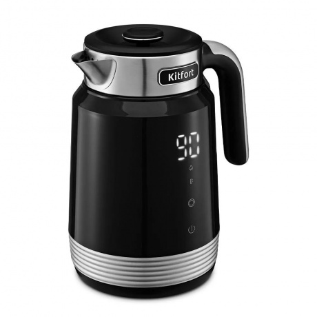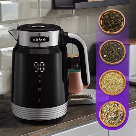 Электрический чайник с электронным терморегулятором Kitfort КТ-6648 может не только вскипятить воду, но и нагреть её до температуры 40, 55, 80 или 90 °С, что очень удобно при заваривании различных сортов чая. Корпус чайника выполнен из сочетания нержавеющей стали и пластика. Ручка выполнена из пластика, а крышка — из сочетания нержавеющей стали и пластика. Крышка чайника съёмная. Минимальная и максимальная отметки находятся на внутренней стороне корпуса. На чайнике расположена панель управления и LED-дисплей. На дисплее отображается текущая температура воды в чайнике, а при установке температуры — температура нагрева воды. Температура воды на дисплее отображается постоянно, что очень удобно. Чайник оснащён функцией поддержания температуры в течение 24 часов. Температура воды контролируется встроенным в дно чайника термодатчиком. Подставка с центральным контактом даёт возможность располагать на ней чайник в любом положении, обсепечивая вращение на 360°. Снизу имеется отсек для хранения шнура, в который можно смотать излишки шнура электропитания, чтобы он не мешал на столе.
