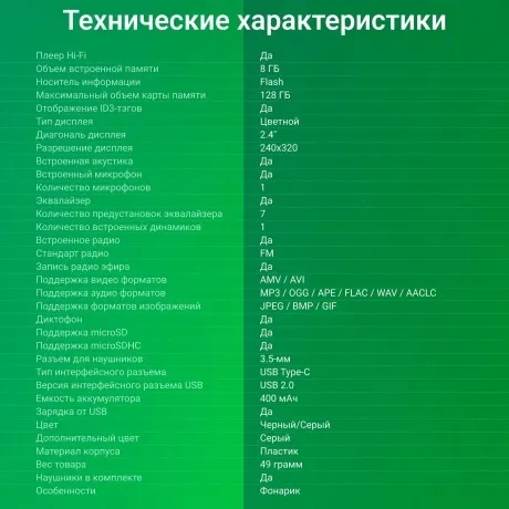 Плеер Digma S5 - это устройство, которое сочетает в себе функциональность и удобство использования. Плеер оснащен встроенной памятью на 8 Гб, что позволяет хранить большое количество музыки, видео и других файлов. Цветной дисплей с диагональю 2.4 и разрешением 240x320 обеспечивает четкое и яркое изображение. Благодаря этому, вы сможете наслаждаться просмотром видео и прослушиванием музыки без потери качества. Плеер поддерживает карты памяти до 128 Гб, что позволяет расширить объем памяти и хранить еще больше файлов. Плеер Digma S5 оснащен удобным и интуитивно понятным интерфейсом, что делает его простым и доступным в использовании. Плеер Digma S5 выполнен в стильном черном и сером цвете, что делает его не только функциональным, но и стильным аксессуаром. Выбирая плеер Digma S5, вы получаете надежный и удобный инструмент для хранения и воспроизведения вашей любимой музыки и видео.
