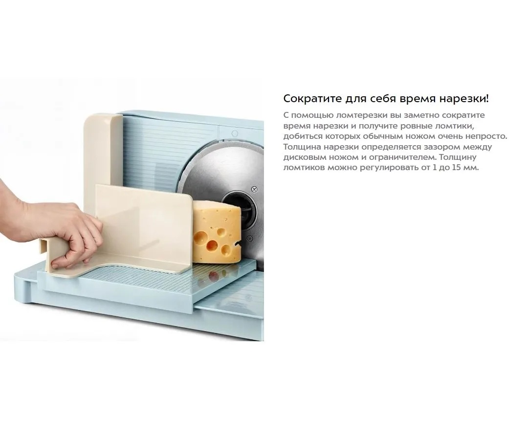 С помощью ломтерезки вы заметно сократите время нарезки и получите ровные ломтики, добиться которых обычным ножом очень непросто. Толщина нарезки определяется зазором между дисковым ножом и ограничителем. Толщину ломтиков можно регулировать от 1 до 15 мм.