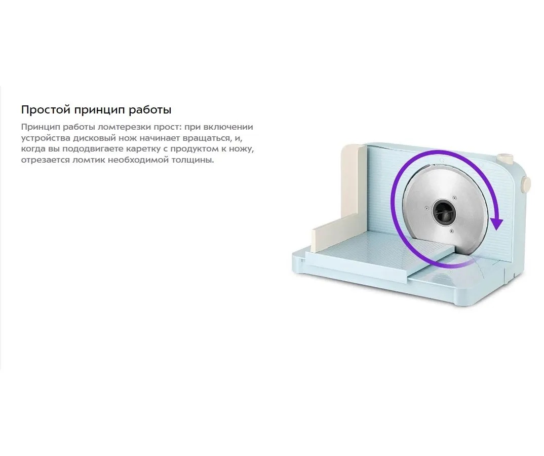 Принцип работы ломтерезки прост: при включении устройства дисковый нож начинает вращаться, и, когда вы пододвигаете каретку с продуктом к ножу, отрезается ломтик необходимой толщины.