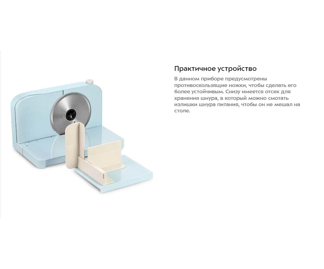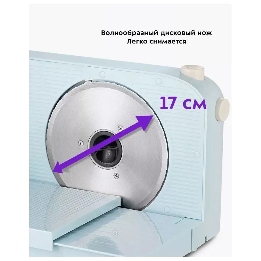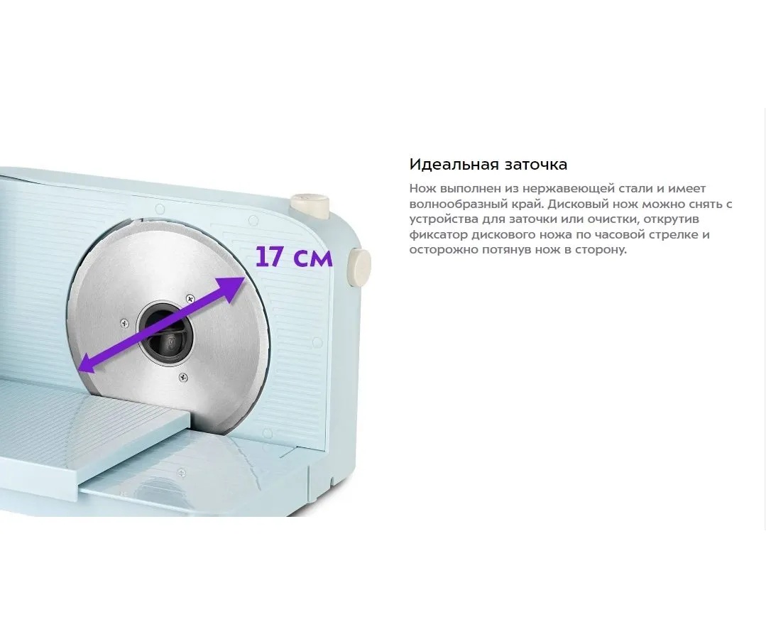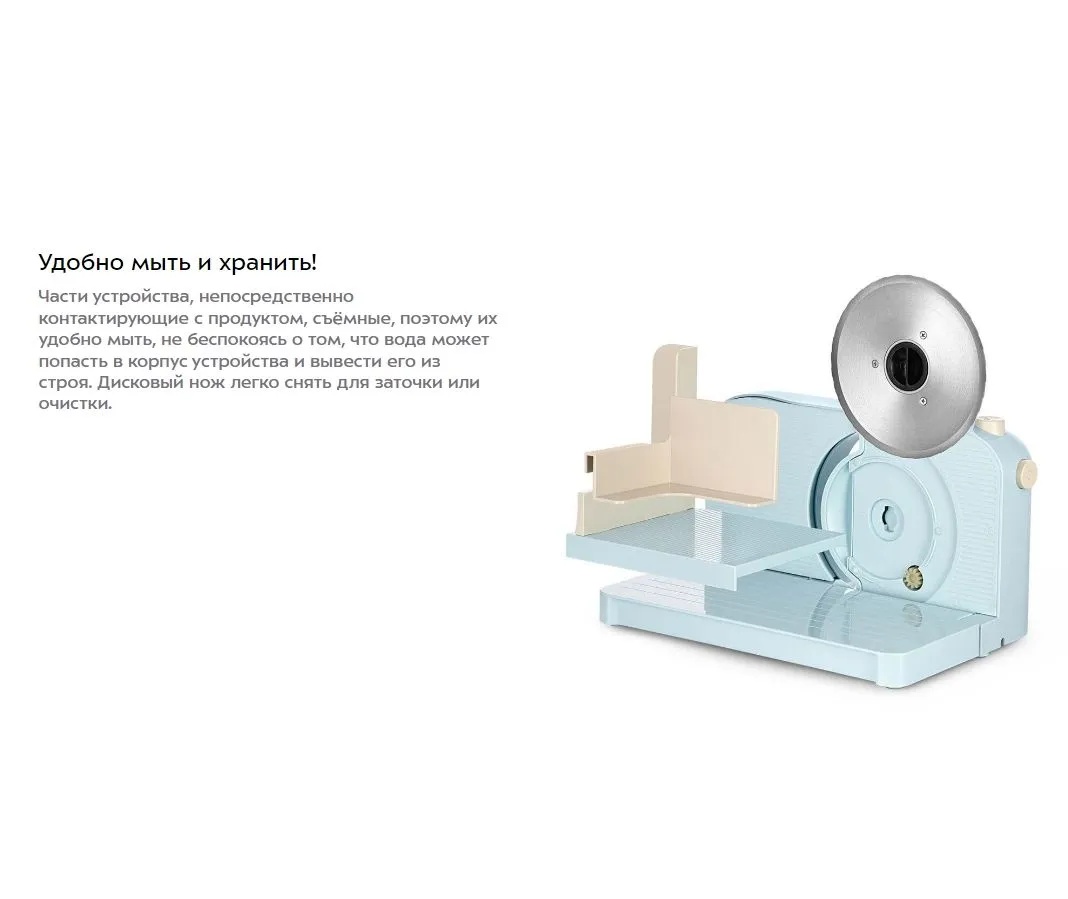 Части устройства, непосредственно контактирующие с продуктом, съёмные, поэтому их удобно мыть, не беспокоясь о том, что вода может попасть в корпус устройства и вывести его из строя. Дисковый нож легко снять для заточки или очистки.