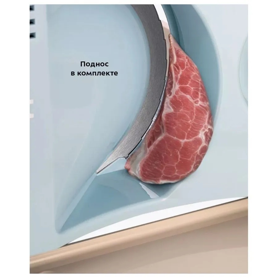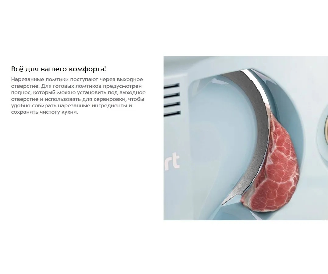 Нарезанные ломтики поступают через выходное отверстие. Для готовых ломтиков предусмотрен поднос, который можно установить под выходное отверстие и использовать для сервировки, чтобы удобно собирать нарезанные ингредиенты и сохранить чистоту кухни.