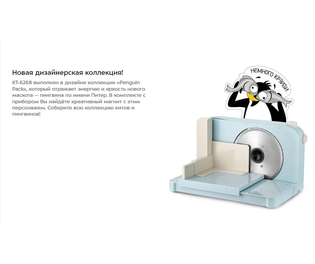 КТ-6268 выполнен в дизайне коллекции «Penguin Pack», который отражает энергию и яркость нового маскота – пингвина по имени Питер. В комплекте с прибором Вы найдёте креативный магнит с этим персонажем. Соберите всю коллекцию китов и пингвинов!