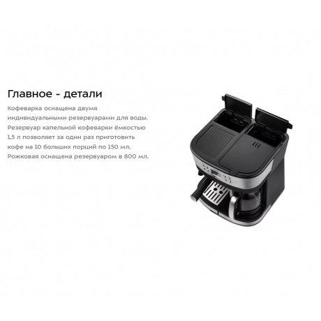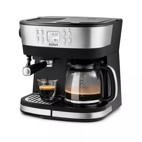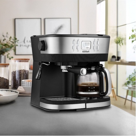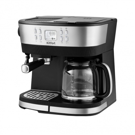 Кофейная станция Kitfort KT-771 совмещает в себе два вида кофеварок: рожковая и капельная. Благодаря чему будет удобна, как и тем, кто пьет все виды кофе и хочет сэкономить место на своей кухне, так и семьям с разными вкусовыми предпочтениями. Кофе, приготовленный в рожковой кофеварке, обладает богатым вкусом и ароматом, а кофе из капельной кофеварки обладает крепостью, которая взбодрит вас и придаст сил. Выбор за вами!. Управление рожковой кофеваркой расположено слева. У капельной кофеварки есть LCD-дисплей с понятными обозначениями всех программ в правой части. Вы можете узнавать даже текущее время по часам на дисплее или настроить крепость вашего фильтр-кофе. Молочную пенку для капучино можно делать самостоятельно. Капучинатор в кофеварке - это паровая трубка с насадкой панарелло. Трубку погружают в холодное молоко, включают подачу пара и взбивают молочную пенку. Приготовление не занимает много времени! Капельная кофеварка оснащена многоразовым нейлоновым фильтром, который удобно мыть после приготовления кофе и использовать снова. Кофеварка оснащена двумя индивидуальными резервуарами для воды. Резервуар капельной кофеварки емкостью 1.5 л позволяет за один раз приготовить кофе на 10 больших порций по 150 мл. Рожковая оснащена резервуаром в 800 мл. Мерная ложка-темпер поможет наполнить рожок и утрамбовать в нем кофейную таблетку. Металлические фильтры для одной и двойной порции эспрессо с лазерным нанесением отверстий долговечны и не требуют использования каких-либо расходующихся частей.