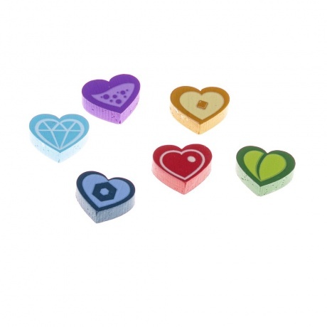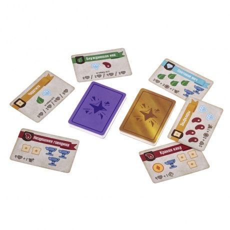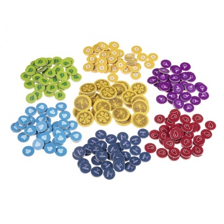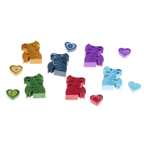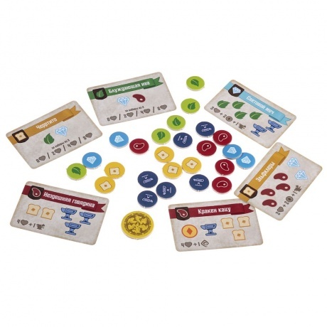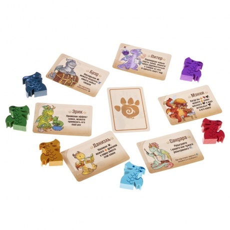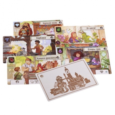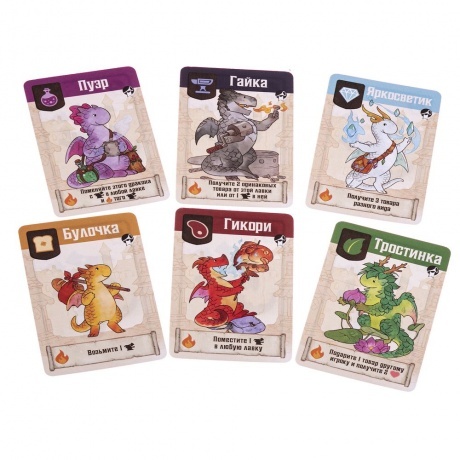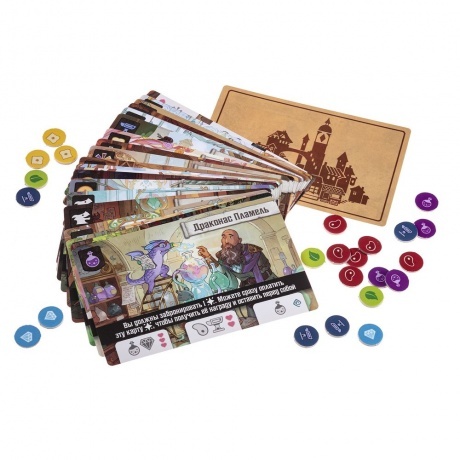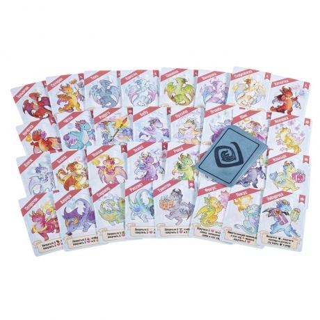 6 деревянных фигурок драконов, 6 деревянных маркеров-сердец, 34 большие карты лавок, 36 карт чар, 36 карт драконов-кудесников, 42 карты драконов-мастеров, неопреновое игровое поле, 24 жетона монет, 210 жетонов товаров, 7 карт драконов-компаньонов, правила игры, 8 памяток