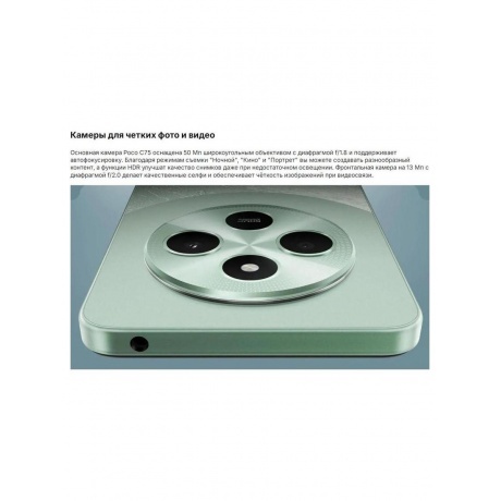 В Xiaomi Poco C75 установлен большой экран диагональю 6.88 дюйма с разрешением 1640х720 точек и поддержкой 167 млн цветов. Матрица IPS Dot Drop отображает более точные и насыщенные цвета, что особенно важно для профессиональной работы с изображениями и видео. Технология Dot Drop позволяет сократить время отклика пикселей, что делает такие матрицы более подходящими для динамичных сцен – игры и видео. Камера получила широкоугольный объектив 50 Мп с 5 линзами и светодиодной подсветкой для съемки ночью. Камера способна снимать видео в разрешении 1920?1080, режиме HDR, поддерживает портретный режим и таймлапс (замедленную съемку). Автофокусировка самостоятельно настраивает уровень освещения и цветопередачу, позволяет получать высококачественные фото.