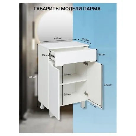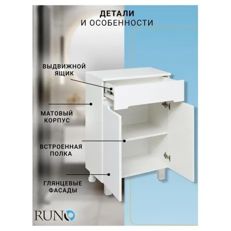 Полупенал Runo Парма функциональное решение для недорогого и современного оснащения ванной комнаты. Шкаф в ванную RUNO (напольный), выполненный в белом цвете, идеально впишется в любой интерьер ванной комнаты. Имеет 1 выдвижной ящик на шариковых направляющих и две распашных дверцы. В нижнем отделении одна внутренняя полка.