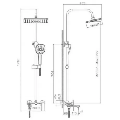 Душевая система Haiba. Изготовлена из высококачественной латуни. Прекрасный тропический душ. Каскадный излив для наполнения ванны, который также служит переключателем потока воды на душ. Душевая штанга регулируется по высоте от 66,3 см до 122,7 см.
