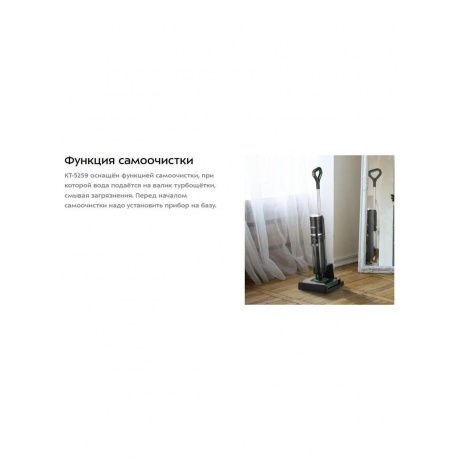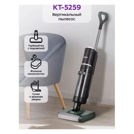 Вертикальный беспроводной моющий пылесос КТ-5259 очень удобен для проведения сухой и влажной уборки. По умолчанию устройство подает воду на валики турбощетки. Для сильных загрязнений предусмотрена усиленная подача воды. Во время работы устройства на дисплее горит индикатор выбранного режима работы‚ уровень заряда в процентах (от 1 до 100), индикатор включения и логотип. Кнопка «Режим» циклически переключает три режима работы. У пылесоса 3 режима работы: влажная уборка со стандартной подачей воды, влажная уборка с усиленной подачей воды и сухая уборка (без подачи воды). Для сильных загрязнений предусмотрена усиленная подача воды.Время работы КТ-5259 – до 30 минут. Резервуары для чистой и грязной воды, а также блок фильтров и валики турбощетки легко снимаются и очищаются. В комплекте идет ершик для чистки валиков турбощетки, резервуаров для воды и всасывающего отверстия. Благодаря непрерывному вращению двух валиков турбощетки с подсветкой поступающая на них вода равномерно распределяется по поверхности пола, а затем всасывается пылесосом. Это обеспечивает эффективную очистку. Запасные валики идут в комплекте. КТ-5259 оснащен функцией самоочистки, при которой вода подается на валик турбощетки, смывая загрязнения. Перед началом самоочистки надо установить прибор на базу. Благодаря системе всасывания моющим пылесосом КТ-5259 можно засасывать пролитые жидкости и убирать влажный мусор, что не получится сделать обычным пылесосом. Удлинительная ручка устройства съемная, поэтому хранить пылесос можно компактно. Для хранения предусмотрена база, на которой устройство заряжается. На базе есть отсеки для хранения валиков турбощетки и фильтра тонкой очистки.