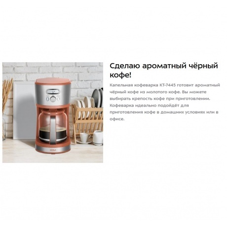 Капельная кофеварка КТ-7445 готовит ароматный чёрный кофе из молотого кофе. Вы можете выбирать крепость кофе при приготовлении. Кофеварка идеально подойдёт для приготовления кофе в домашних условиях или в офисе.