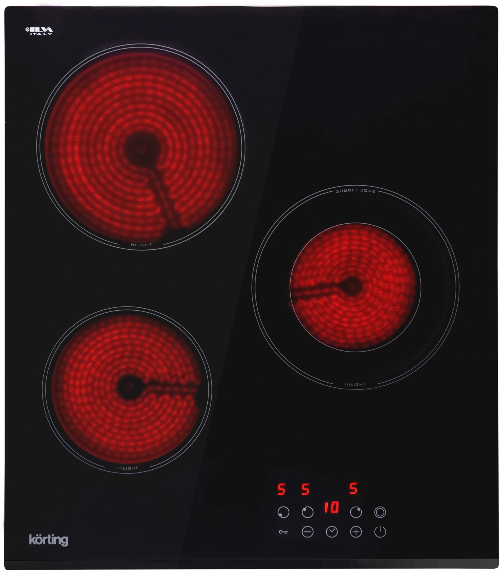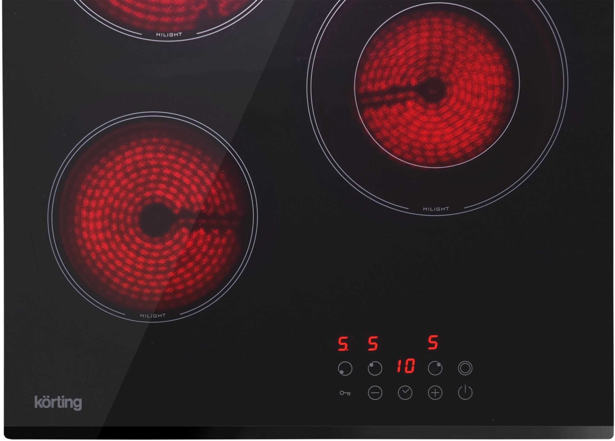 Данная варочная панель имеет классический электрический нагрев, при котором сначала раскаляются конфорки (точнее элементы, скрытые под поверхностью), а затем передают это тепло посуде. Разобраться, как с ней работать, просто даже пожилым людям, привыкшим к плитам. Количество конфорок в этой модели: 3. Особенности панели конфорок, на которые стоит обратить внимание: Hi-Light. Электрические конфорки обеспечивают высокую скорость разогрева и при этом довольно экономичны. Цвет — черный. Материал самой поверхности: стеклокерамика. Управление этой моделью электронное. Для переключения уровней нагрева, выбора функций используются следующие переключатели: сенсорные/TouchControl, сенсорный слайдер/TouchSlider. Продвинутая система контроля за прибором делают его современным и отвечающим на главные запросы покупателя. В вашем распоряжении разные степени нагрева — каждая из них может понадобиться в зависимости от рецепта, а также от цели: приготовления, разогрева уже готовых блюд и т.д. Регулировка 9-ступенчатая. встраиваемые электрические приборы не комплектуются вилкой для подключения к электрической сети