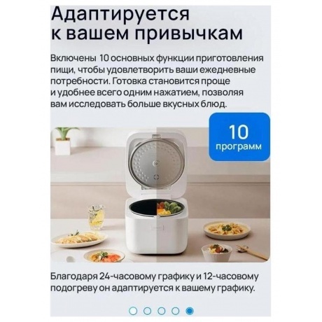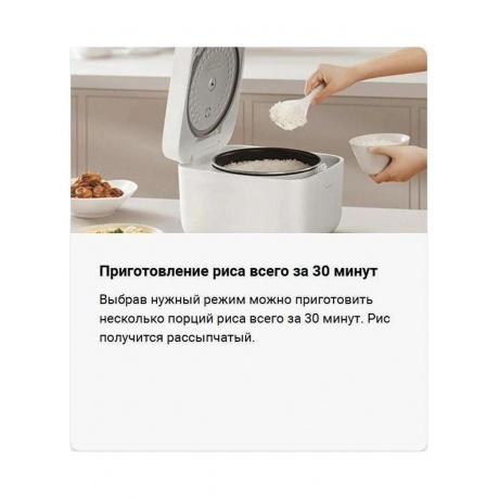 Рисоварка Xiaomi Smart Multifunctional Rice Cooker 4L оснащена 10 предустановленными режимами работы, которые позволяют выбрать оптимальный режим для разных потребностей. С помощью этой рисоварки вы сможете приготовить рассыпчатый рис всего за 30 минут. Усовершенствованный паровой клапан с шестью отверстиями предотвращает переполнение и обеспечивает равномерный выпуск пара, что облегчает контроль над процессом готовки. Чаша из шести слоёв обеспечивает равномерный нагрев и длительное удержание тепла, гарантируя стабильность и равномерность температуры внутри кастрюли. Высокая мощность нагрева 935 Вт позволяет быстро нагреть чашу и эффективно кипятить воду, благодаря чему рис получается равномерно и идеально приготовленным. Антипригарное покрытие облегчает процесс мытья чаши и предотвращает пригорание риса. Большой объём чаши в 4 литра позволяет приготовить до 16 порций риса или запечь целую небольшую курицу. Сенсорное управление и дисплей делают рисоварку простой и лёгкой в использовании, а таймер и функция поддержания тепла позволяют выставить время приготовления до 24 часов и поддерживать тепло на протяжении 12 часов. Встроенные ручки для переноски облегчают переноску и транспортировку рисоварки, а открытие крышки одним нажатием предотвращает получение ожогов от пара.