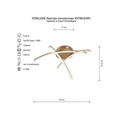 светодиодная люстра vitaluce v2709-8/3pl мощностью 30 вт с цветовой температурой 4000к и световым потоком 2320 лм предназначена для освещения площади до 9 кв.м выполнена в стиле лофт с металлическим основанием и золотистым каркасом оснащена тремя светодиодными лампами с максимальной мощностью 30 вт каждая
