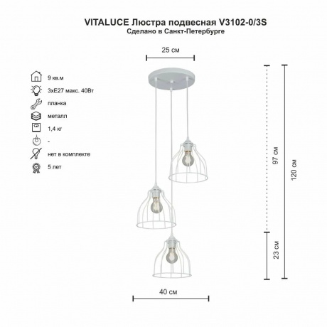 подвесная люстра vitaluce v3102-0/3s с тремя лампами, цоколь e27, максимальная мощность 40 вт, белого цвета.