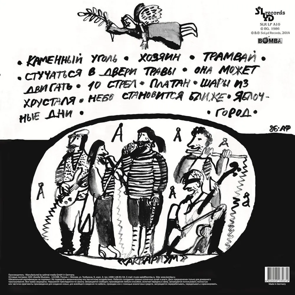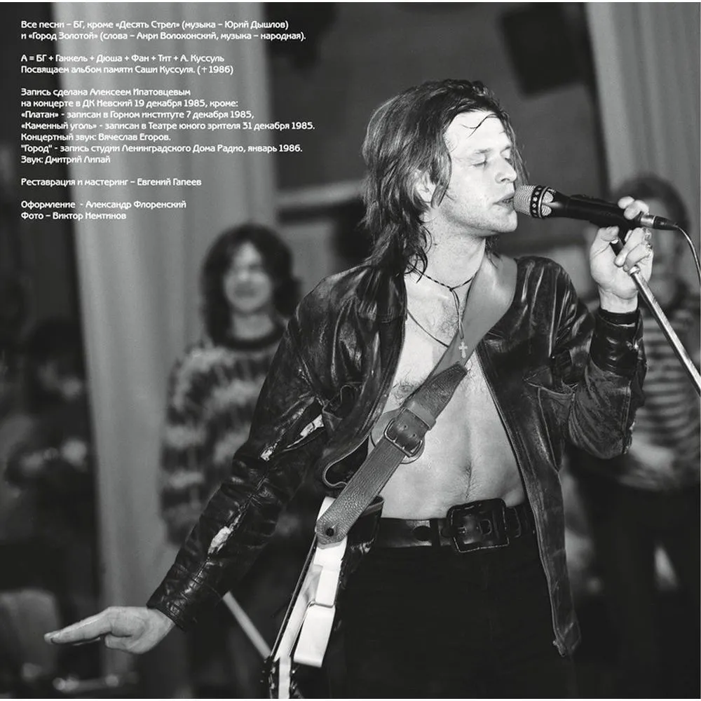 18+. Настоящий материал (информация) произведен, распространен и (или) направлен иностранным агентом Гребенщиковым Борисом Борисовичем, содержащимся в реестр иностранных агентов либо касается деятельности иностранного агента Гребенщикова Бориса Борисовича, содержащегося в реестре иностранных агентов. Концертный альбом под номером два и считающийся “естественным” и значащийся официальным в дискографии коллектива был выпущен в 1986 году и посвящен памяти Александра Куссуля - участнику коллектива, игравшему на скрипке. Фундаментом альбома послужили записи, сделанные между 1985-1986 гг, а издавался он на всех типах носителей. На виниле, магнитофонных кассетах и компакт-дисках.