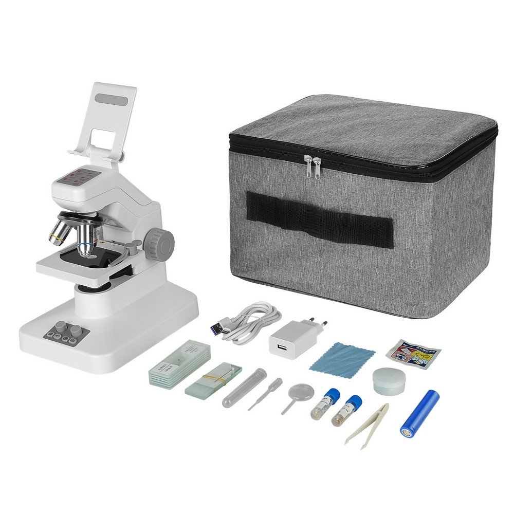 Цифровой микроскоп для исследований в проходящем и отраженном свете с просмотром изображений на мониторе ПК или смартфона. Увеличение 80х - 1600х. Светодиодные осветители. Питание от аккумулятора или от сети через адаптер.