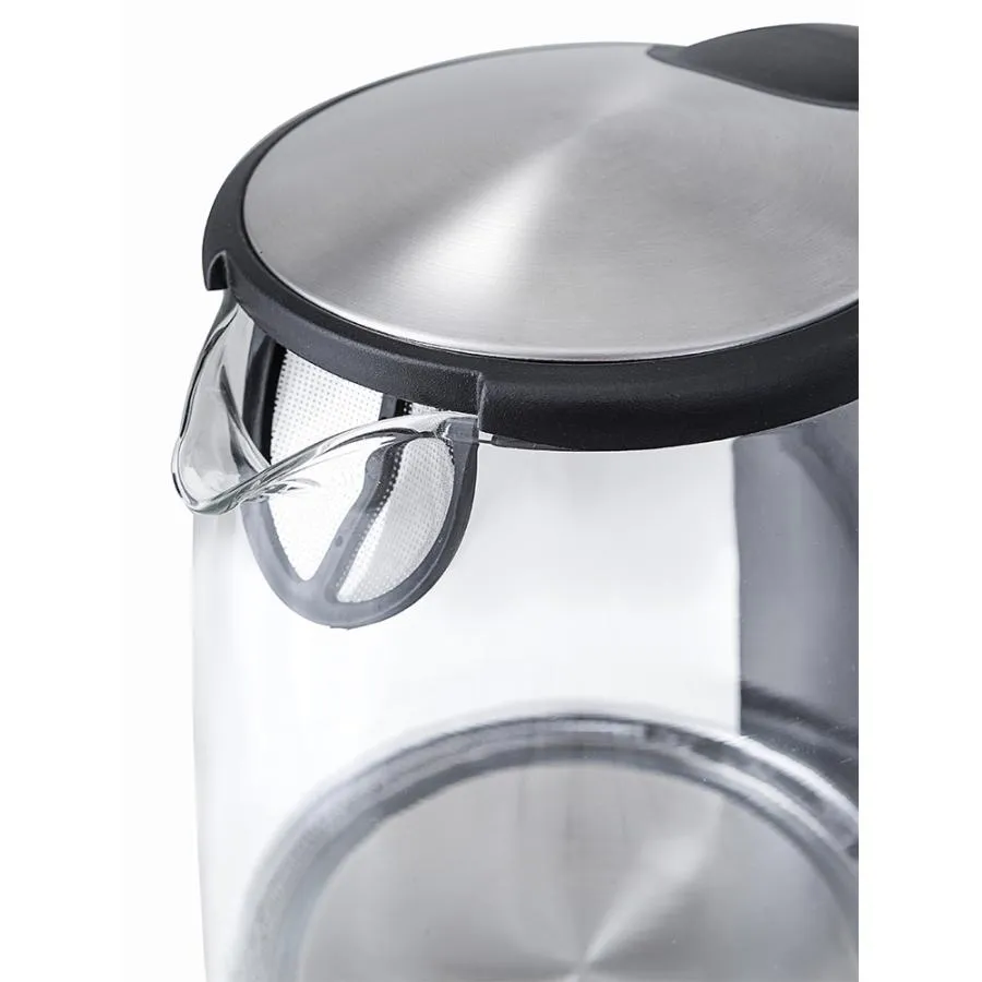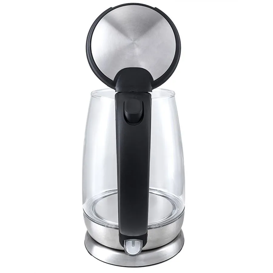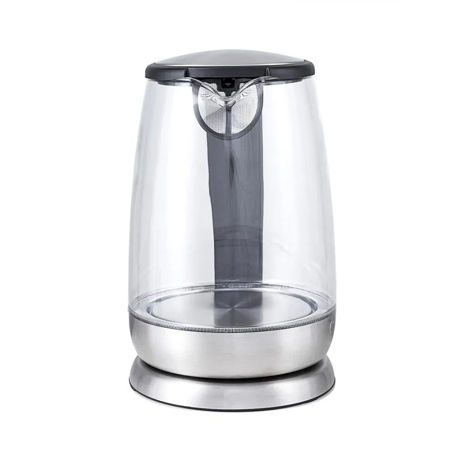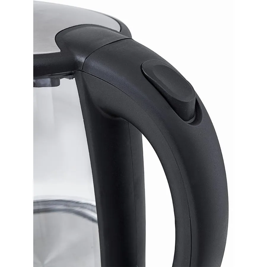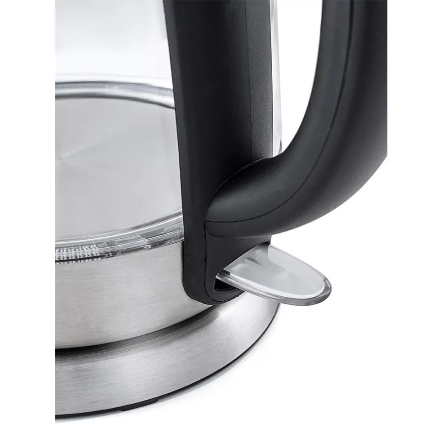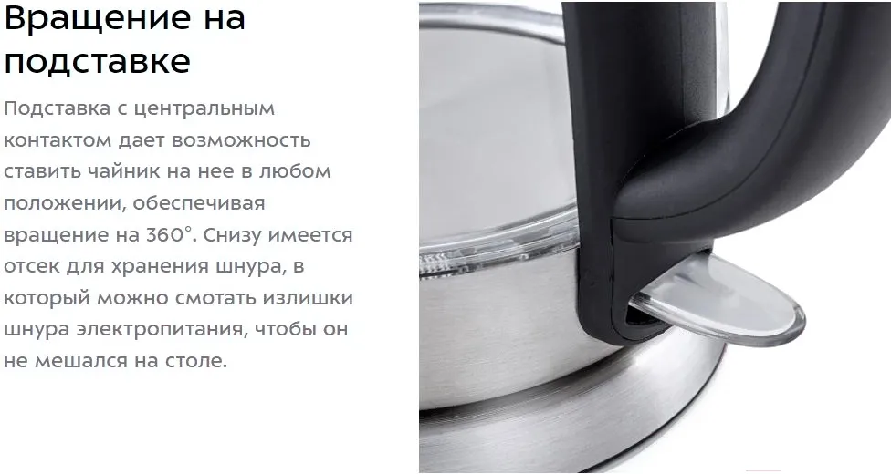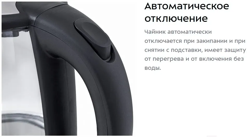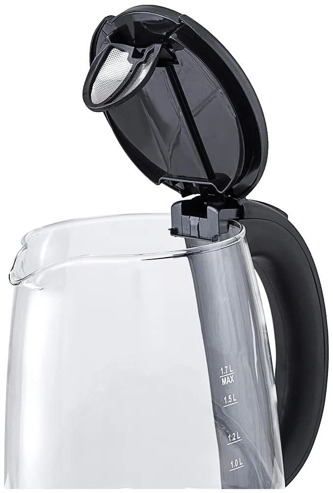 Корпус чайника выполнен из стекла, а крышка и подставка - из сочетания пластмассы и нержавеющей стали. Мерная шкала нанесена на прозрачную часть корпуса. Ручка чайника пластиковая, не нагревается и удобно лежит в руке