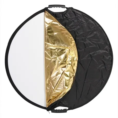 Круглый отражатель 5 в 1: золотистый/серебристый/белый отражающий/ белый просвечивающий/черный. Диаметр 82 см, используется в предметной и портретной съемке, а также для подсветки участков кадра. Золотистая поверхность придает отраженному свету золотистые тона, добавляет теплого света в сцену. Серебристая поверхность используется для получения жесткого света, что позволяет получать контрастное изображение с четкими тенями. Высокий коэффициент отражения делает эту поверхность одной из часто используемых, найдет применение даже в пасмурную погоду. Белая отражающая поверхность позволяет получить равномерный и мягкий световой поток для подсветки теней и выравнивания светотеневого рисунка, используется как заполняющий источник. Не искажает цветовую температуру источника освещения. Просвечивающая ткань рассеивает проходящий сквозь нее световой поток от вспышки и равномерно освещает объект съемки увеличенной площадью излучения. Таким образом, резкий точечный свет, излучаемый при срабатывании фотовспышки, преобразуется в достаточно мягкий световой поток, излучаемый с большей площади. Черная поверхность поглощает большую часть света, используется для углубления теней и отсекания паразитных засветок, также применяется при съемках поверхностей с бликами. Конструкция состоит из пружинного стального обруча с натянутой на него полупрозрачной рассеивающей тканью и чехла на молнии со светоформирующими поверхностями. Упругий каркас прошит по периметру капроновым карманом, диаметр отражателя в сложенном виде – 30 см. Две рукоятки, закрепленные на каркасе, оборудованы отверстиями с резьбой 1/4, что позволяет закрепить отражатель на штативах или любых опорах без использования специального держателя.