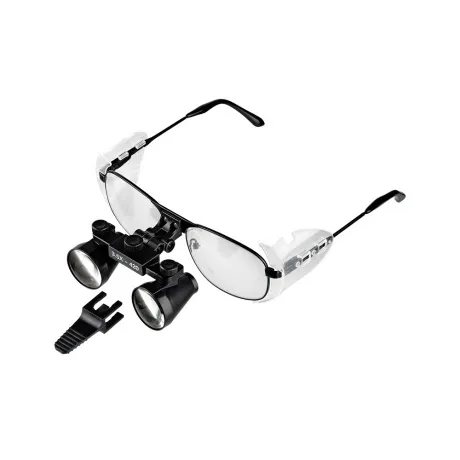 два шарнира для наклона линз лупы, регулируемые по длине дужки, регулируемое межзрачковое расстояние, увеличенные защитные линзы очков, большое поле зрения с хорошим качеством изображения, надежное крепление лупы при наблюдении