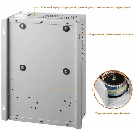 Стабилизатор напряжения ЗУБР 59387-10, предназначен для точного и быстрого выравнивания сетевого напряжения для защиты бытовой техники и оборудования. Шесть степеней защиты: от перегрузки, от короткого замыкания, от перегрева, от опасного повышенного напряжения, от опасного пониженного напряжения, от импульсных перенапряжений. Наличие задержки включения для защиты аппаратуры от бросков напряжения. Наличие термозащиты обеспечивает отключение нагрузки при повышении температуры автотрансформатора. Металлопластиковый корпус обеспечивает сохранность приборов и пожаробезопасность. Возможность автоматического отключения нагрузки при превышении предельного значения выходного напряжения. Автоматическое подключение нагрузки при восстановлении выходного напряжения. Регулировка выходного напряжения в широком диапазоне, дискретным способом, без искажения формы сигнала. Сохранение рабочего состояния при коротких по времени перегрузках. Фильтрация сетевых помех. Контроль напряжения на входе и выходе.