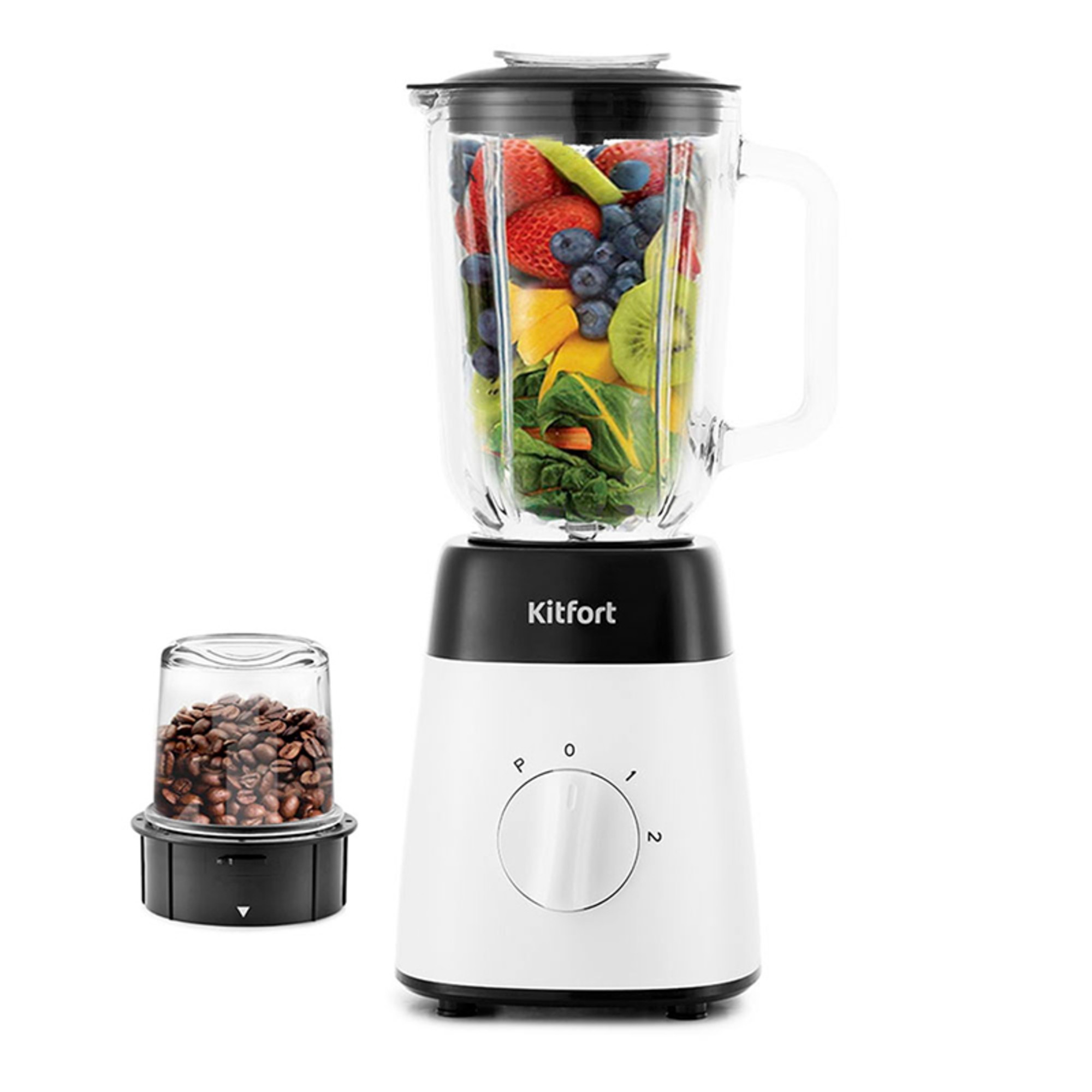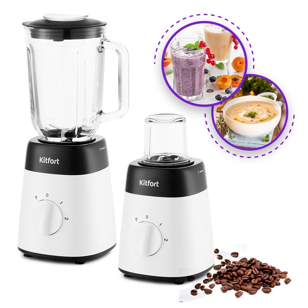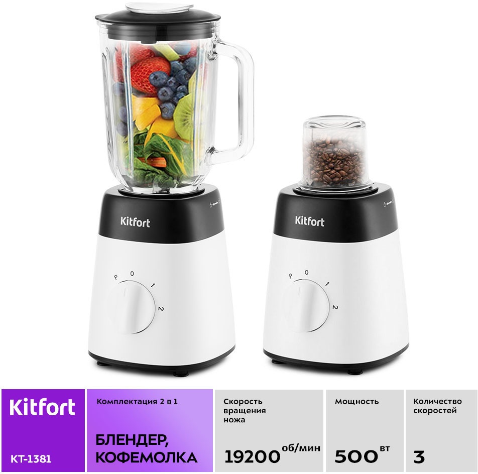 Блендер Kitfort КТ-1381 мощностью 500 Вт обладает классическим стационарным корпусом белого цвета. Представленная модель способна справляться с разными задачами, от измельчения фруктов и овощей в пюре до замешивания жидкого теста для блинчиков. С насадкой-кофемолкой зерна будут «превращаться» в качественную основу для вашего любимого напитка. Мельничка для специй поможет приобрести пряностям мелкую однородную структуру. Для этого модель имеет две скорости вращения, 15000 и 19200 оборотов в минуту. Прозрачный кувшин прибора благодаря объему 1.5 л вмещает сразу несколько порций пищи. За счет того, что емкость изготовлена из закаленного стекла, она отличается высокой прочностью. Кроме того, ее легко снимать за счет ручки сбоку и просто мыть. Благодаря нескользящим ножкам блендер Kitfort КТ-1381 не перемещается по столу даже во время интенсивной работы.