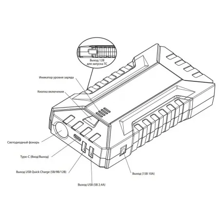 4-ячеечная структура встроенной батареи, наличие выхода USB QuickCharge для ускоренной зарядки мобильной электроники, наличие порта USB Type-C 15W, функционирующего в режиме вход/выход, более мощный выход для питания автоприборов — 15в/10а, ащита от неправильного подключения полярности, от короткого замыкания, перезаряда и переразряда, защита от обратного тока после запуска транспортного средства.