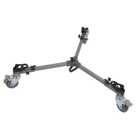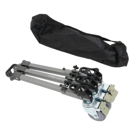 GreenBean TrackMaster 03 – складная операторская тележка профессионального исполнения, предназначена для установки крупных и тяжелых штативов и стоек, нагрузка на тележку составляет 25 кг. Расстояние от середины основания до середины отверстия под шипы (радиус тележки) составляет 50 см. Тележка универсальная, с регулируемым положением упоров под размах ног треноги или стойки, подходит для крепления обычных (с резиновыми наконечниками) или шипованных (с двумя шипами) опор видеоштатива. Используется при различных видах видеосъемки – для плавных проводок в кадре по прямой траектории или дуге с разными радиусами, и в том числе для поворота камеры вокруг своей оси или съемки «одним кадром». Три больших колеса ? 100 мм с шарикоподшипниками позволяют тележке плавно перемещаться внутри помещения студии или на улице, преодолевая такие препятствия, как кабель-канал, электрические провода, небольшие неровности. Каждое колесо оснащено индивидуальным тормозом, и вы можете заблокировать любое из колес, какое будет удобнее. Опорные сегменты платформы выполнены из квадратной трубы сечением 25х25 мм, которая позволит выдерживать значительные нагрузки. Тележка раскладывается разведением сегментов профиля, которые зажимаются фиксирующим винтом. Размах треноги регулируется перемещением опор вдоль профиля сегментов на нужное расстояние и фиксацией винтами. Обычные или шипованные опоры закрепляются в резиновых хомутах или в специальных винтовых зажимах с подпятниками тележки (в зависимости от типа опоры штатива). По окончанию съемок тележка так же быстро складывается и упаковывается в комплектный чехол для транспортировки и хранения. Для переноски тележки без чехла предусмотрена ручка. В сложенном виде длина тележки составляет 60 см, а вес – 4.8 кг.