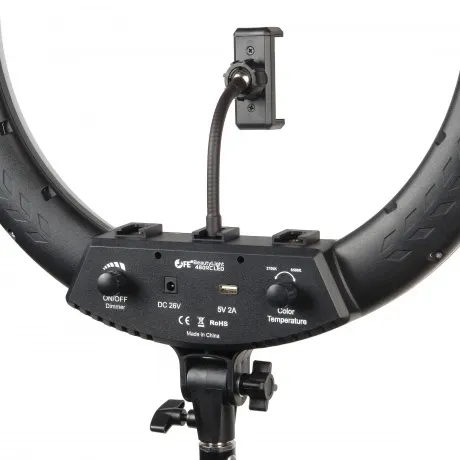 Falcon Eyes BeautyLight 480RC LED – компактный кольцевой осветитель со световой панелью внешним диаметром 46 см, на которой расположено 240 светодиодов теплого и холодного света, с плавно регулируемой мощностью светового потока от 10 до 100% (50 Вт). Пользователь может одним диммером выставить нужную цветовую температуру, а другим уже регулировать мощность светового потока. Держатель для смартфона и пульт дистанционного управления входят в комплект. Кольцевые осветители могут использоваться в качестве постоянного света различных сферах фото и видеосъемок: предметной, портретной и др. Но наибольшей популярностью кольцевые осветители пользуются у блогеров, стилистов, визажистов, фотографов и видеографов, в задачи которых входит съемка людей крупным планом. Мягкое бестеневое освещение выравнивает тон лица, а кольцевая форма создает интересные блики в глазах. Регулировка цветовой температуры в пределах 2700-6500К позволяет использовать осветитель в помещениях, где присутствуют и другие источники света с различной цветовой температурой. Таким образом можно легко подобрать «правильные»,естественные оттенки цвета на лице модели без манипуляций со светом из паразитных источников.